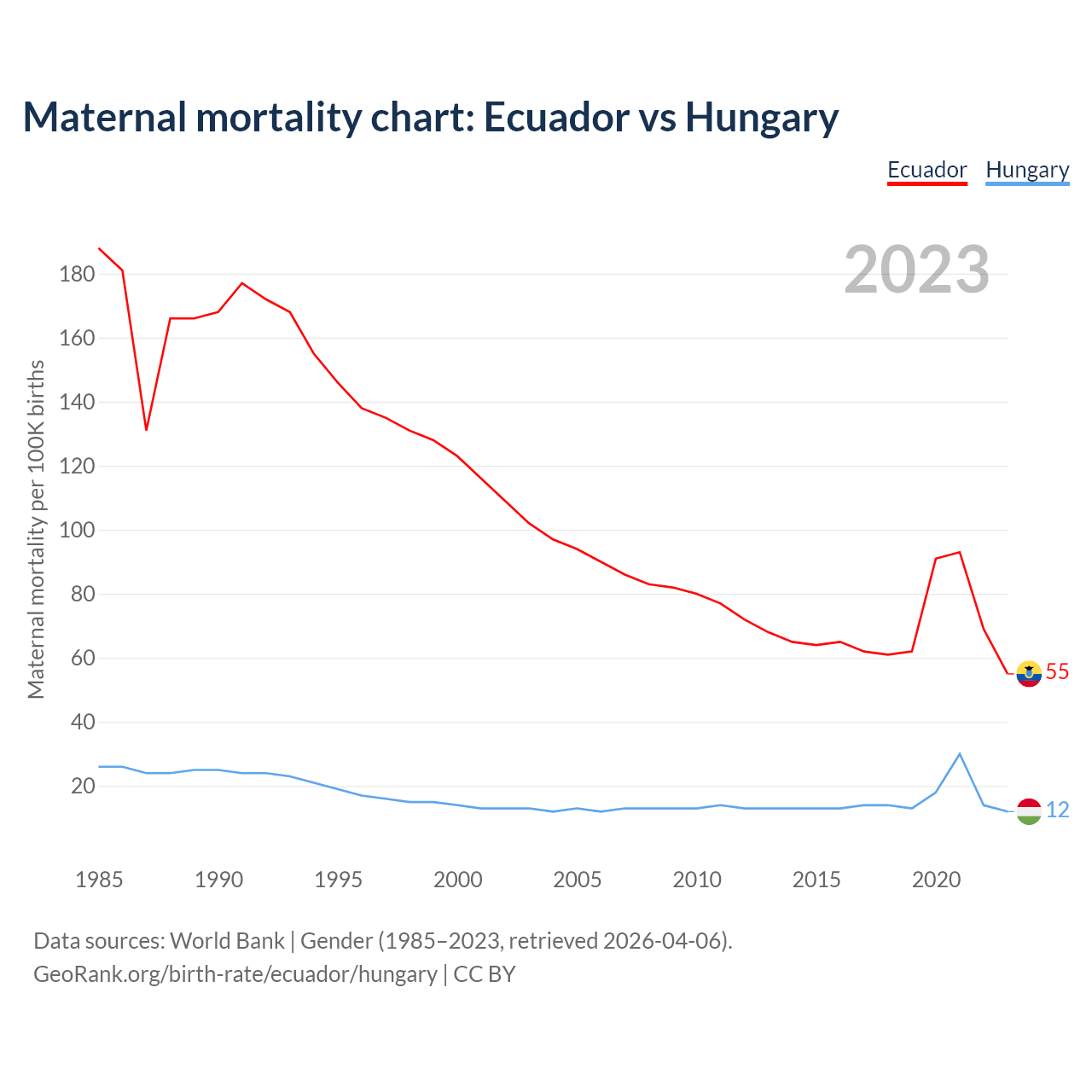 The maternal mortality rate, which is the probability of dying during childbirth or within 42 days of pregnancy termination, is 55 deaths per 100,000 live births in Ecuador, compared to 12 deaths in Hungary.