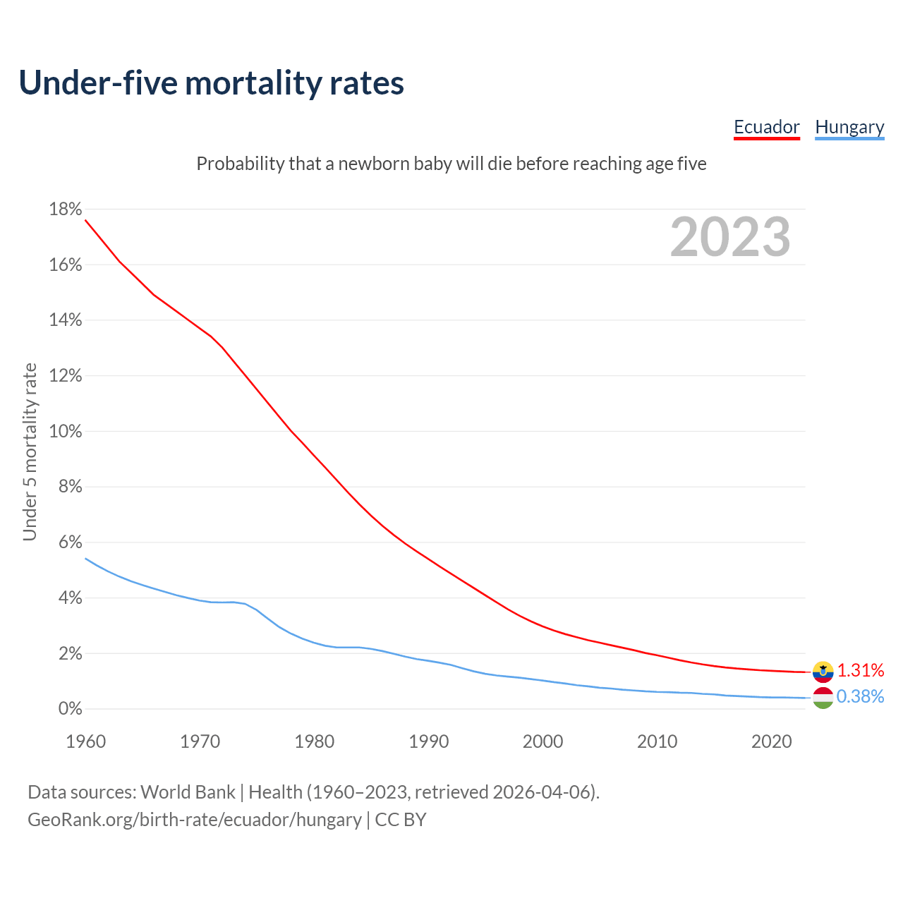 The chance that a newborn baby will die before reaching age five is 1.31% in Ecuador and 0.38% in Hungary. Above is a chart with historical data on under-five mortality rates.