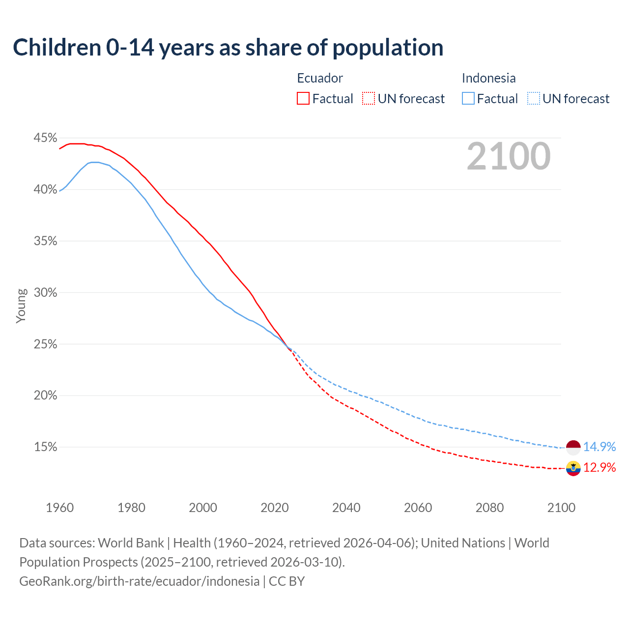 According to the latest available data on birth rates, the fertility rate in Ecuador was 1.82 children per woman in 2023, compared to 2.13 in Indonesia in 2023. The replacement level is considered to be 2.1 children per woman.