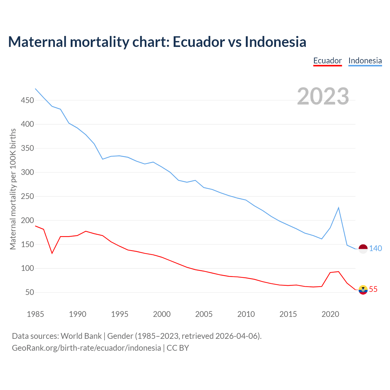 The maternal mortality rate, which is the probability of dying during childbirth or within 42 days of pregnancy termination, is 55 deaths per 100,000 live births in Ecuador, compared to 140 deaths in Indonesia.