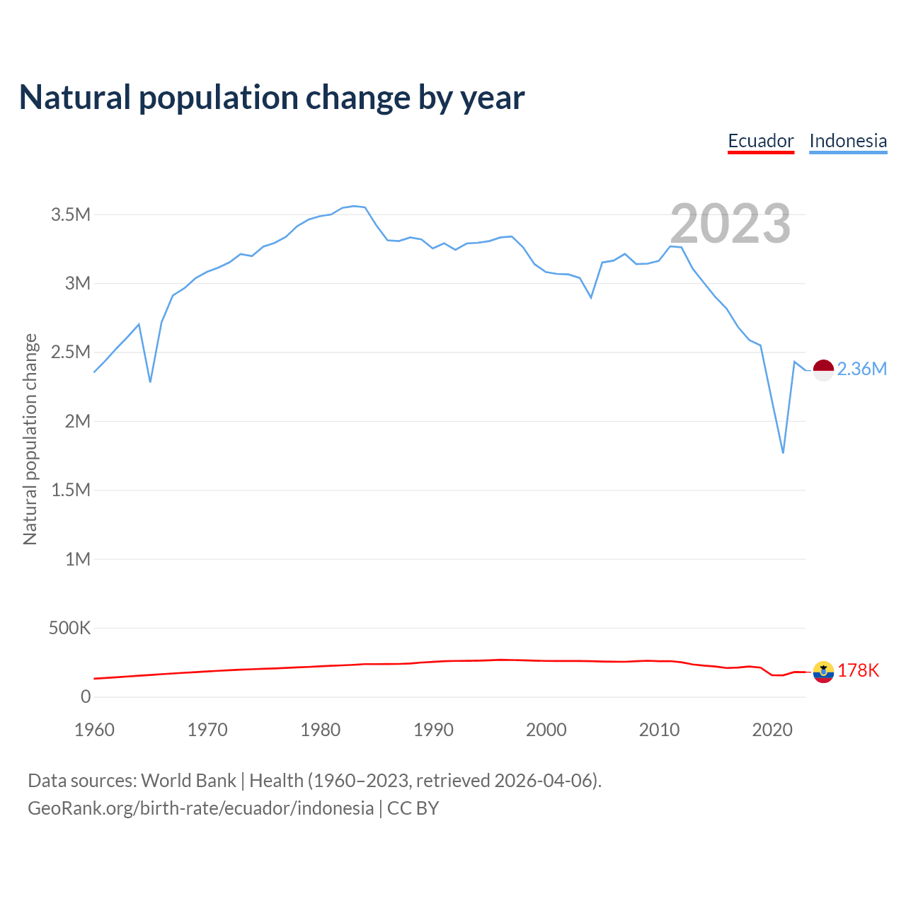 Ecuador has an annual birth rate of 15 births per 1,000 people, compared to 15.9 for Indonesia. The average number of children a woman is expected to have during her lifetime — the fertility rate, is 1.82 in Ecuador and 2.13 in Indonesia — 16.7% difference.