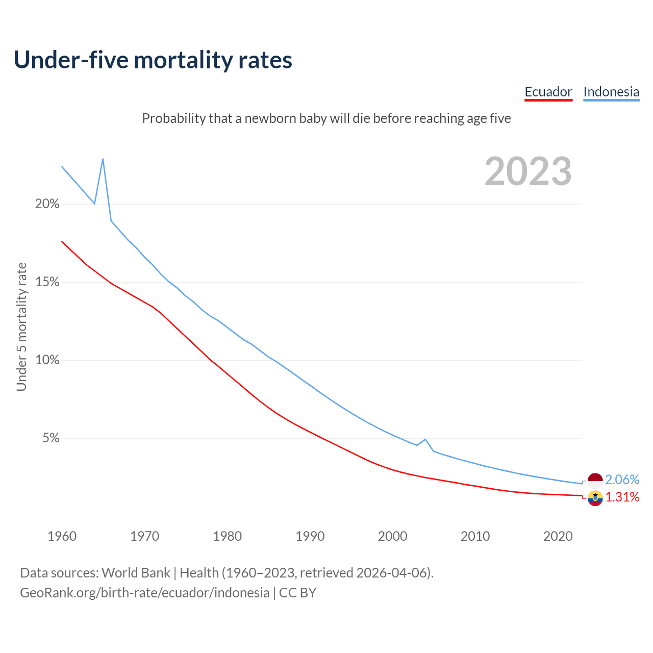 The chance that a newborn baby will die before reaching age five is 1.31% in Ecuador and 2.06% in Indonesia. Above is a chart with historical data on under-five mortality rates.