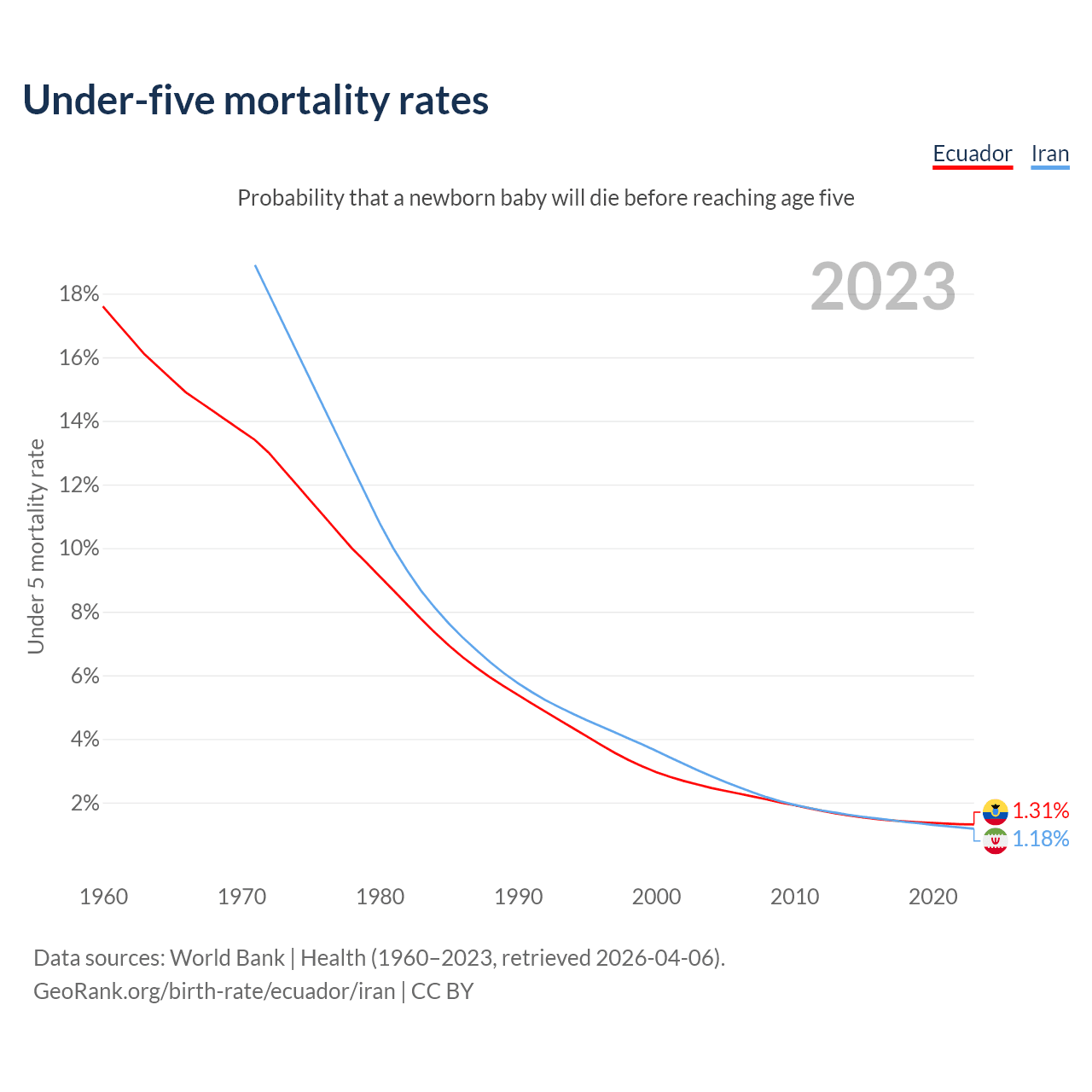 The chance that a newborn baby will die before reaching age five is 1.31% in Ecuador and 1.18% in Iran. Above is a chart with historical data on under-five mortality rates.