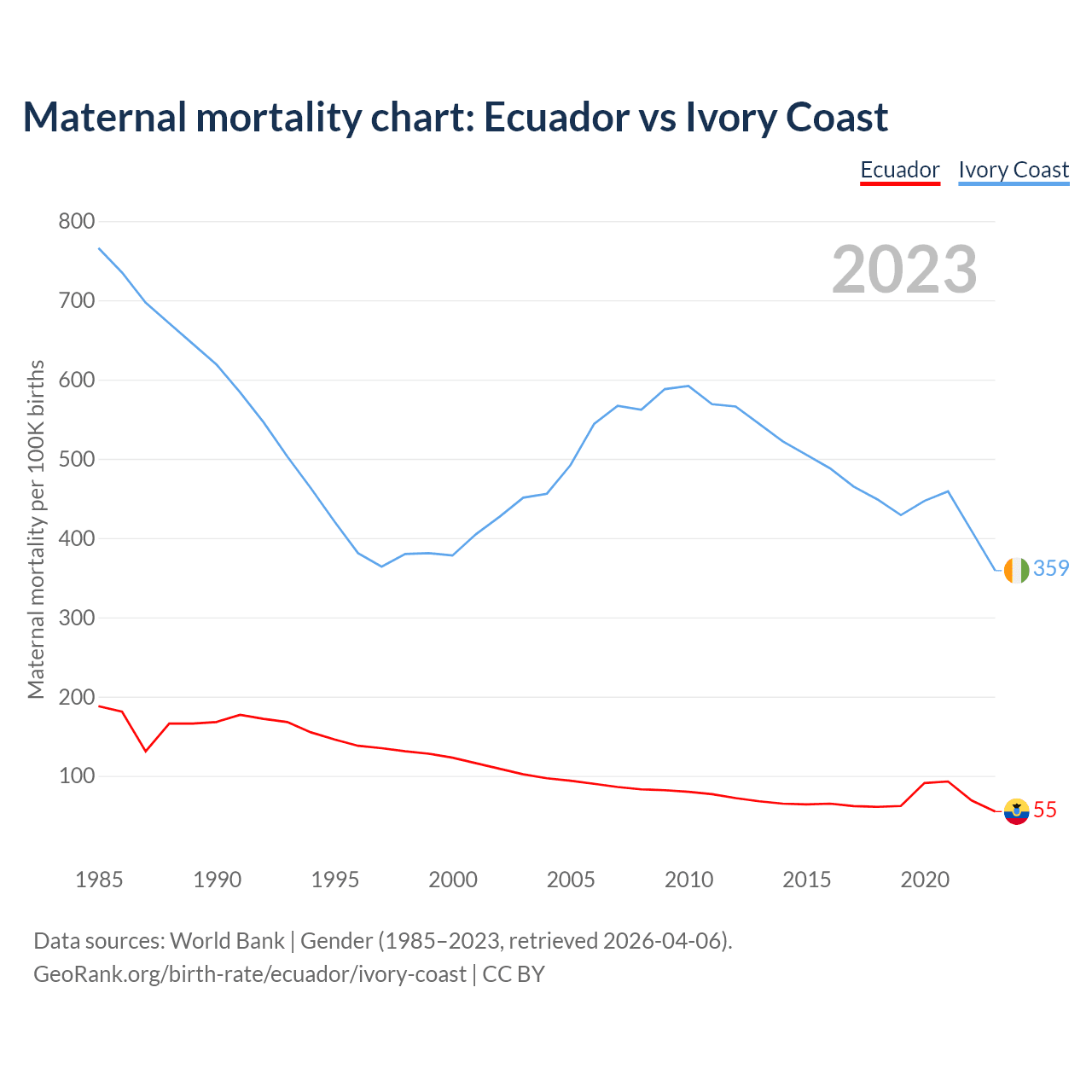 The maternal mortality rate, which is the probability of dying during childbirth or within 42 days of pregnancy termination, is 55 deaths per 100,000 live births in Ecuador, compared to 359 deaths in Ivory Coast.