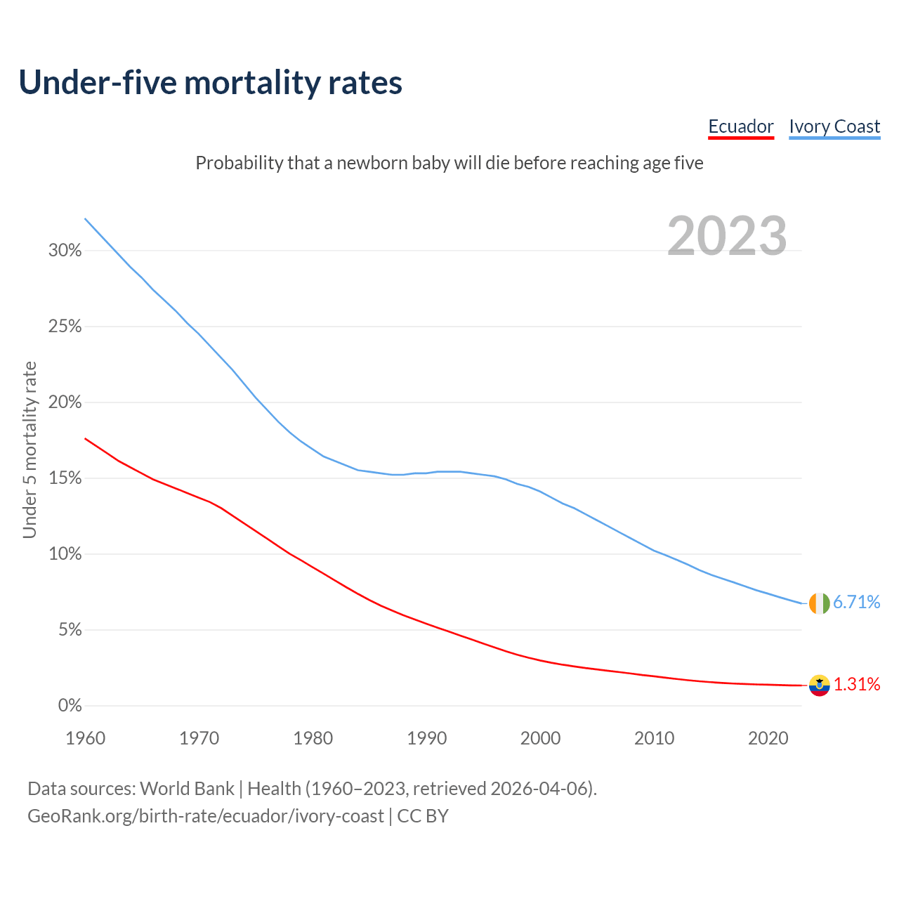 The chance that a newborn baby will die before reaching age five is 1.31% in Ecuador and 6.71% in Ivory Coast. Above is a chart with historical data on under-five mortality rates.