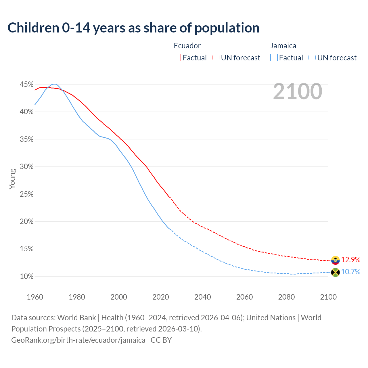 According to the latest available data on birth rates, the fertility rate in Ecuador was 1.82 children per woman in 2023, compared to 1.36 in Jamaica in 2023. The replacement level is considered to be 2.1 children per woman.