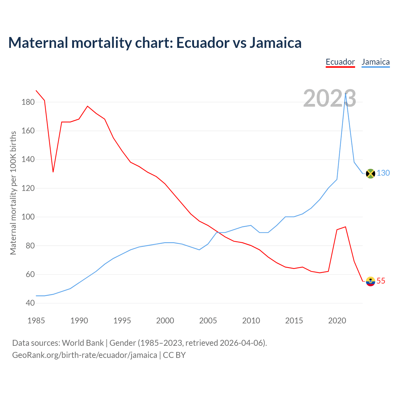 The maternal mortality rate, which is the probability of dying during childbirth or within 42 days of pregnancy termination, is 55 deaths per 100,000 live births in Ecuador, compared to 130 deaths in Jamaica.