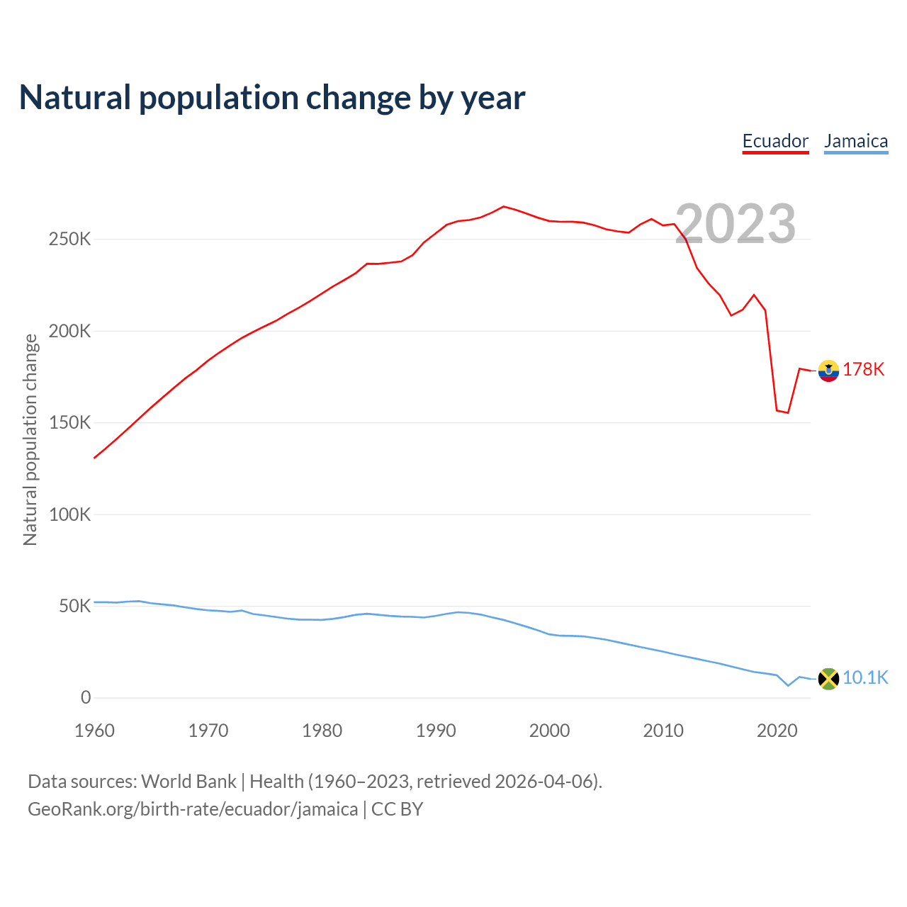 Ecuador has an annual birth rate of 15 births per 1,000 people, compared to 11.6 for Jamaica. The average number of children a woman is expected to have during her lifetime — the fertility rate, is 1.82 in Ecuador and 1.36 in Jamaica — 25.5% difference.