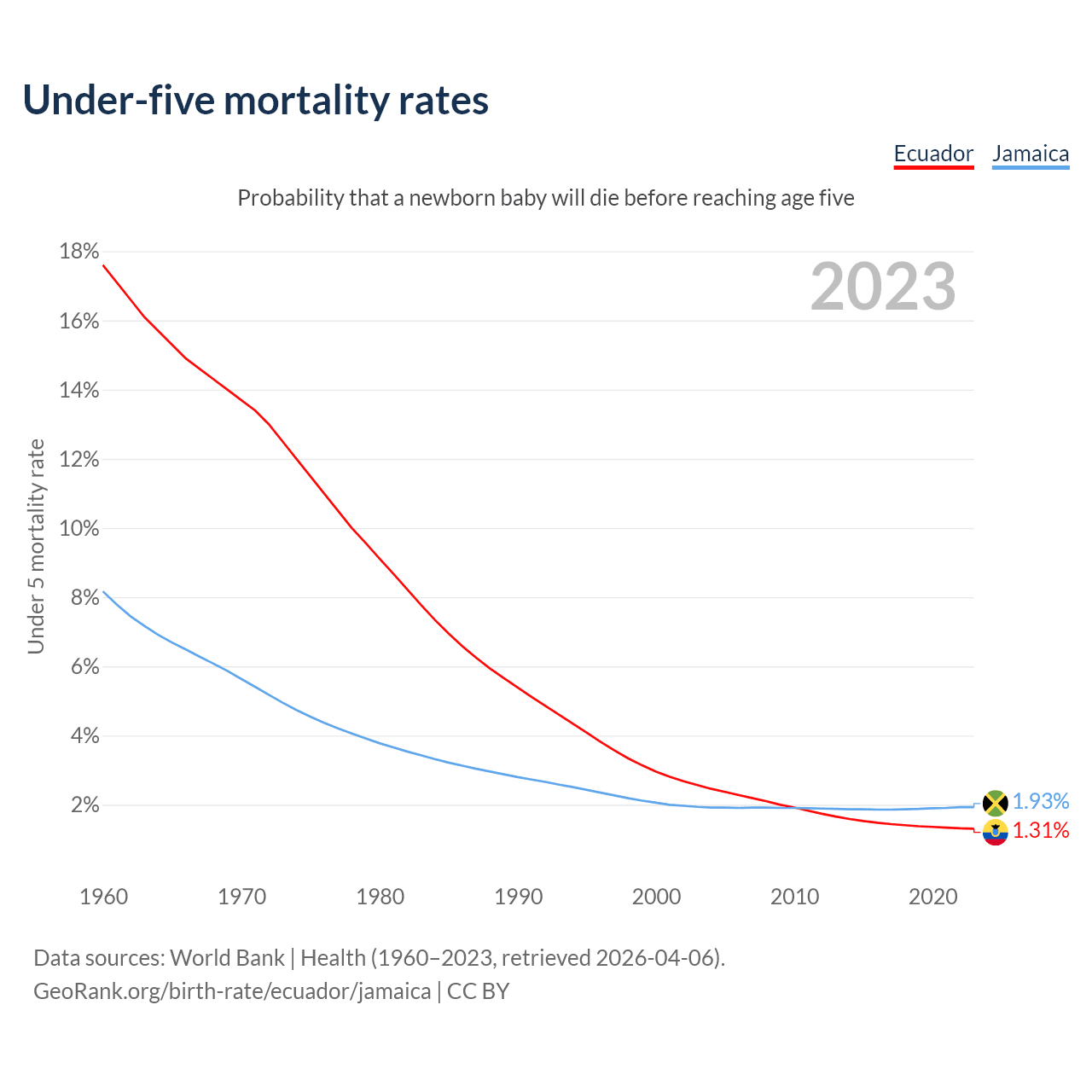 The chance that a newborn baby will die before reaching age five is 1.31% in Ecuador and 1.93% in Jamaica. Above is a chart with historical data on under-five mortality rates.