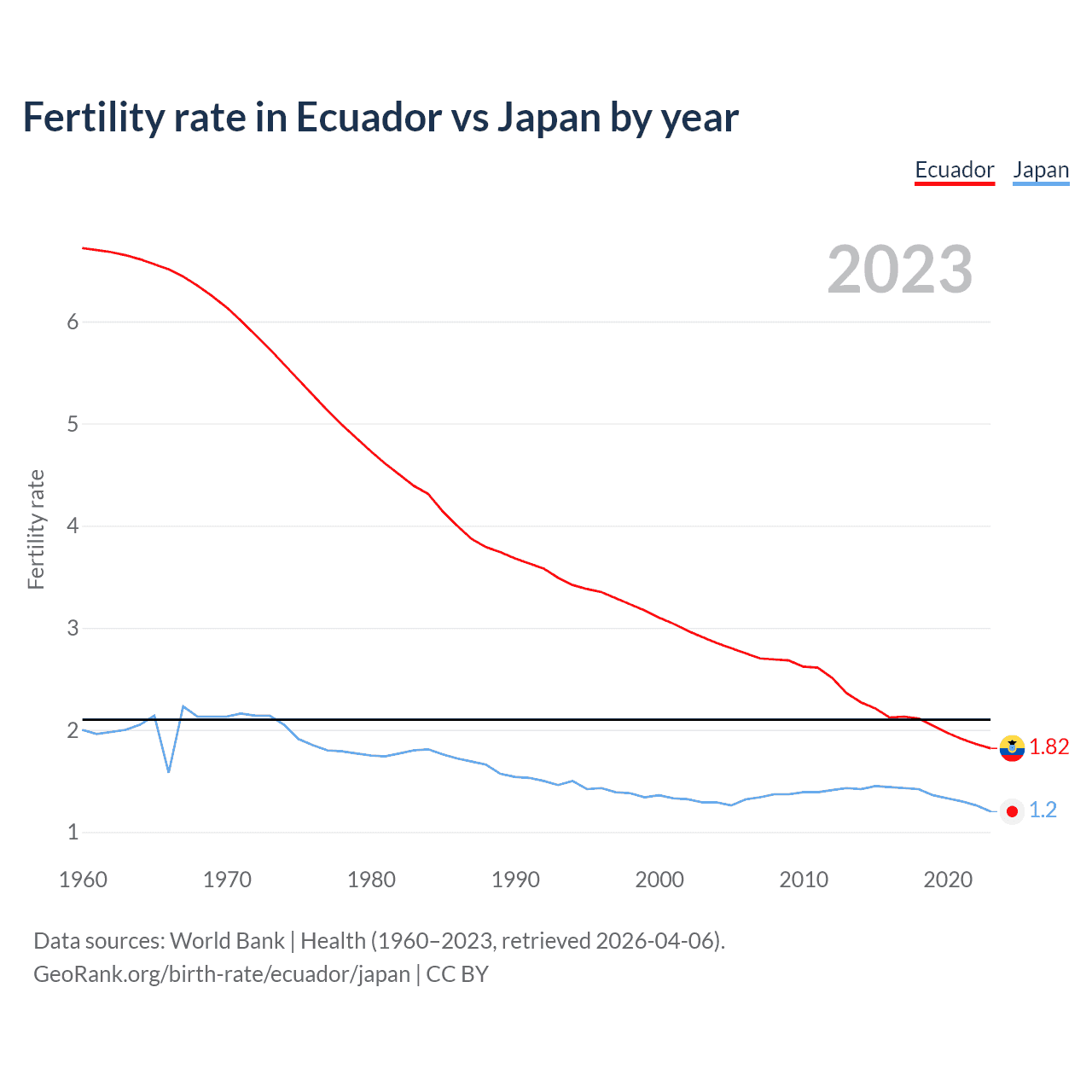 According to the latest available data on birth rates, the fertility rate in Ecuador was 1.82 children per woman in 2023, compared to 1.2 in Japan in 2023. The replacement level is considered to be 2.1 children per woman.