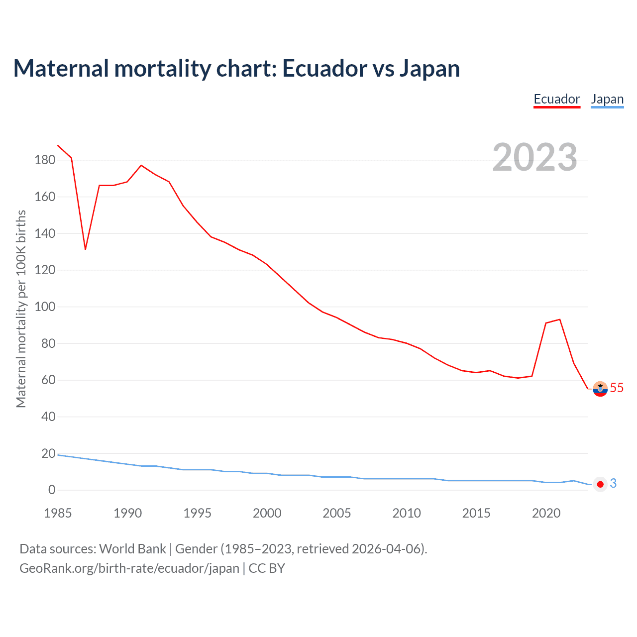 The maternal mortality rate, which is the probability of dying during childbirth or within 42 days of pregnancy termination, is 55 deaths per 100,000 live births in Ecuador, compared to 3 deaths in Japan.