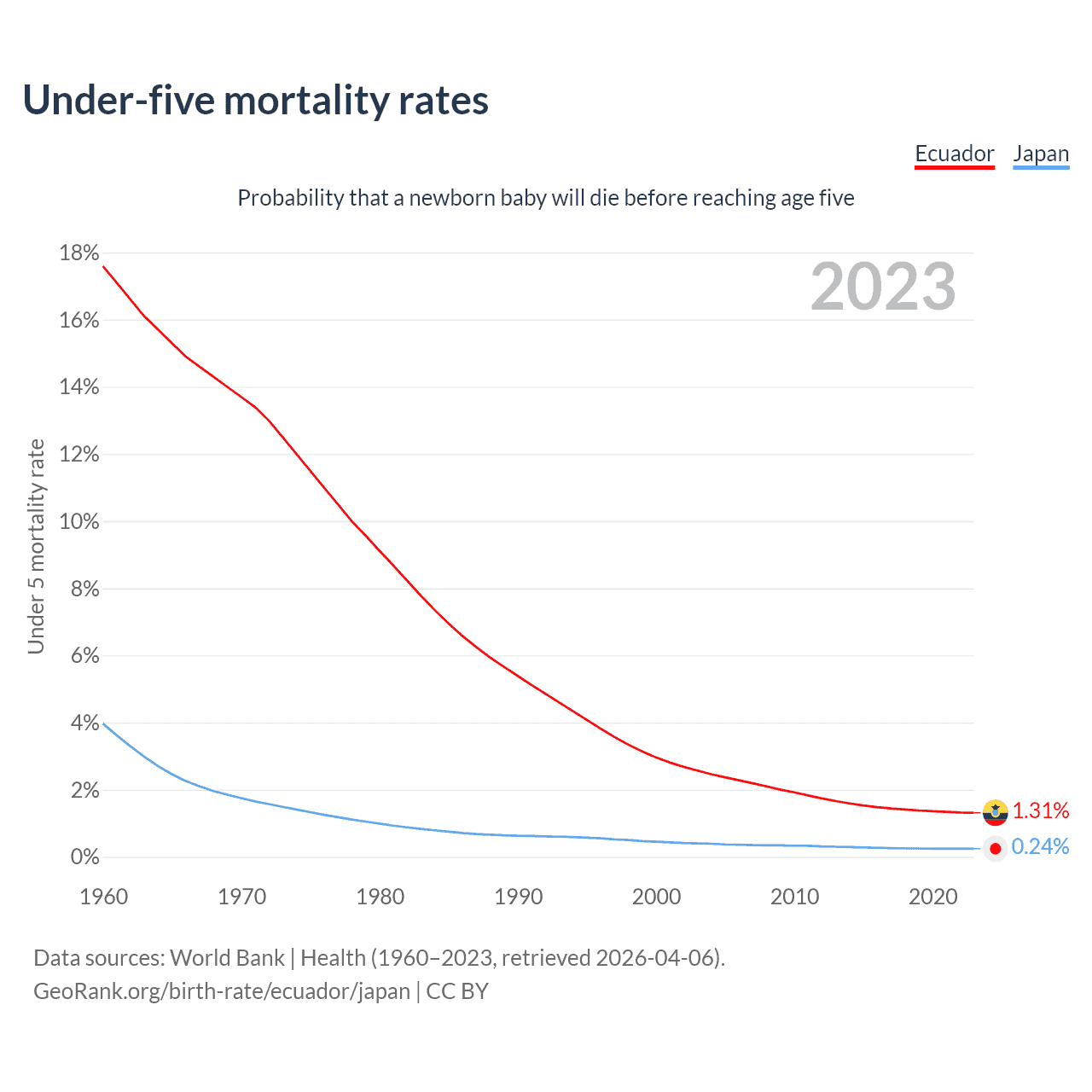 The chance that a newborn baby will die before reaching age five is 1.31% in Ecuador and 0.24% in Japan. Above is a chart with historical data on under-five mortality rates.