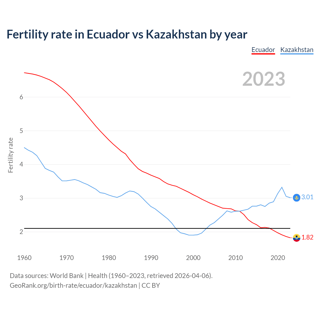 1960 vs 2023, the fertility rate has decreased by 72.9% in Ecuador and by 33% in Kazakhstan — in 1960, it was 6.72 and 4.5, respectively.