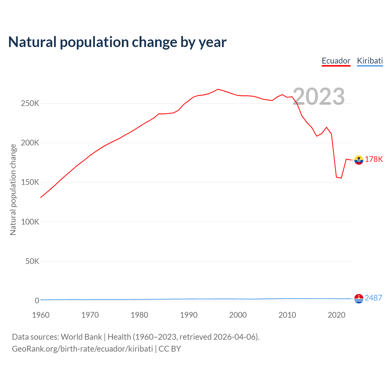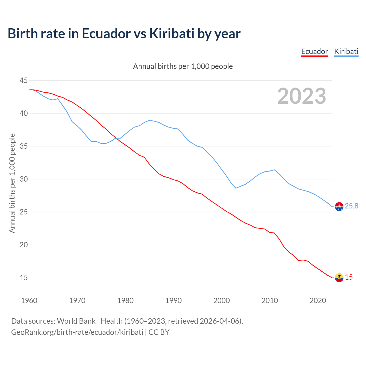 Ecuador has an annual birth rate of 15 births per 1,000 people, compared to 25.8 for Kiribati. The average number of children a woman is expected to have during her lifetime — the fertility rate, is 1.82 in Ecuador and 3.15 in Kiribati — 72.6% difference.