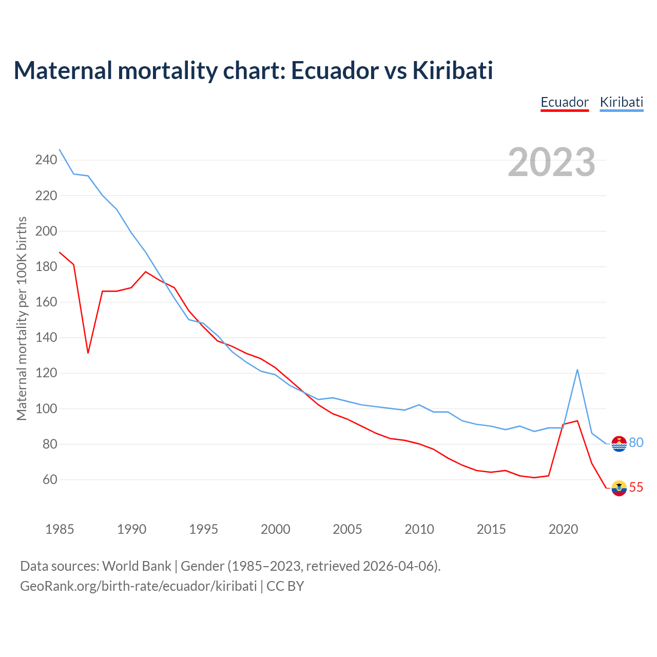 The maternal mortality rate, which is the probability of dying during childbirth or within 42 days of pregnancy termination, is 55 deaths per 100,000 live births in Ecuador, compared to 80 deaths in Kiribati.