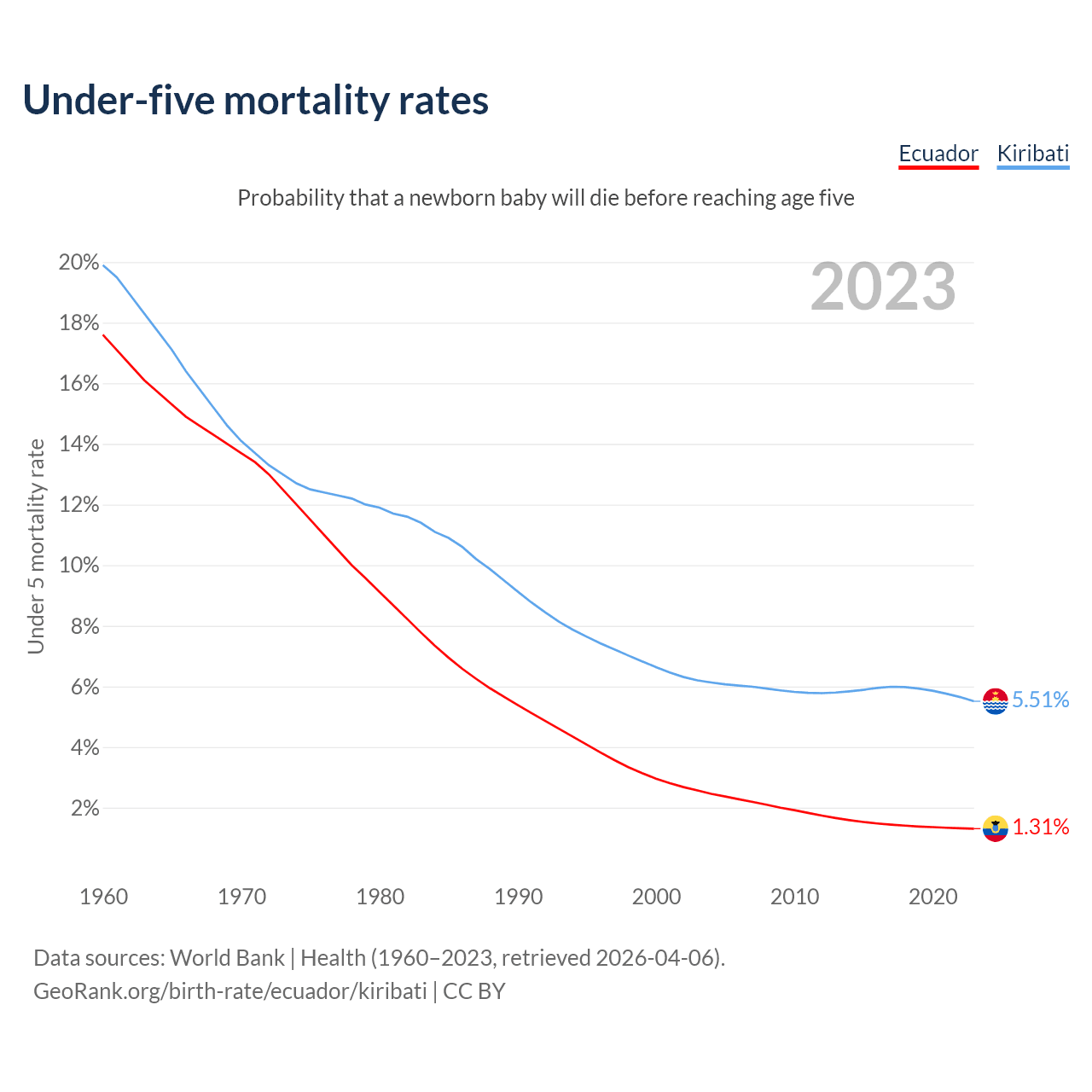 The chance that a newborn baby will die before reaching age five is 1.31% in Ecuador and 5.51% in Kiribati. Above is a chart with historical data on under-five mortality rates.