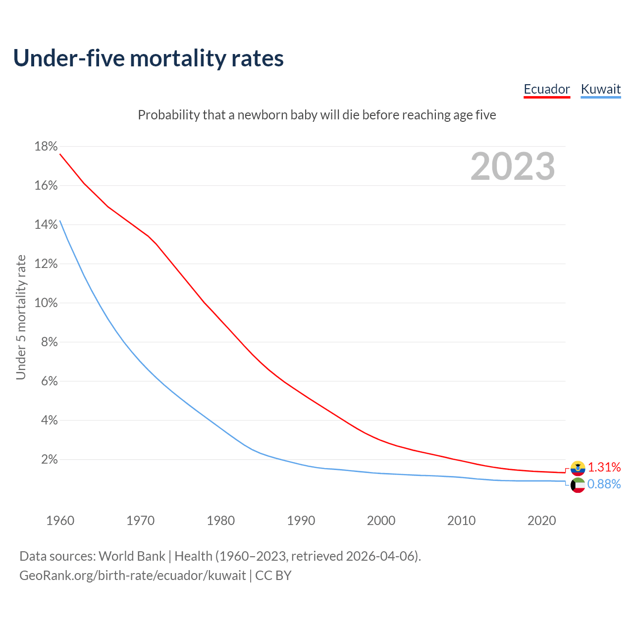 The chance that a newborn baby will die before reaching age five is 1.31% in Ecuador and 0.88% in Kuwait. Above is a chart with historical data on under-five mortality rates.