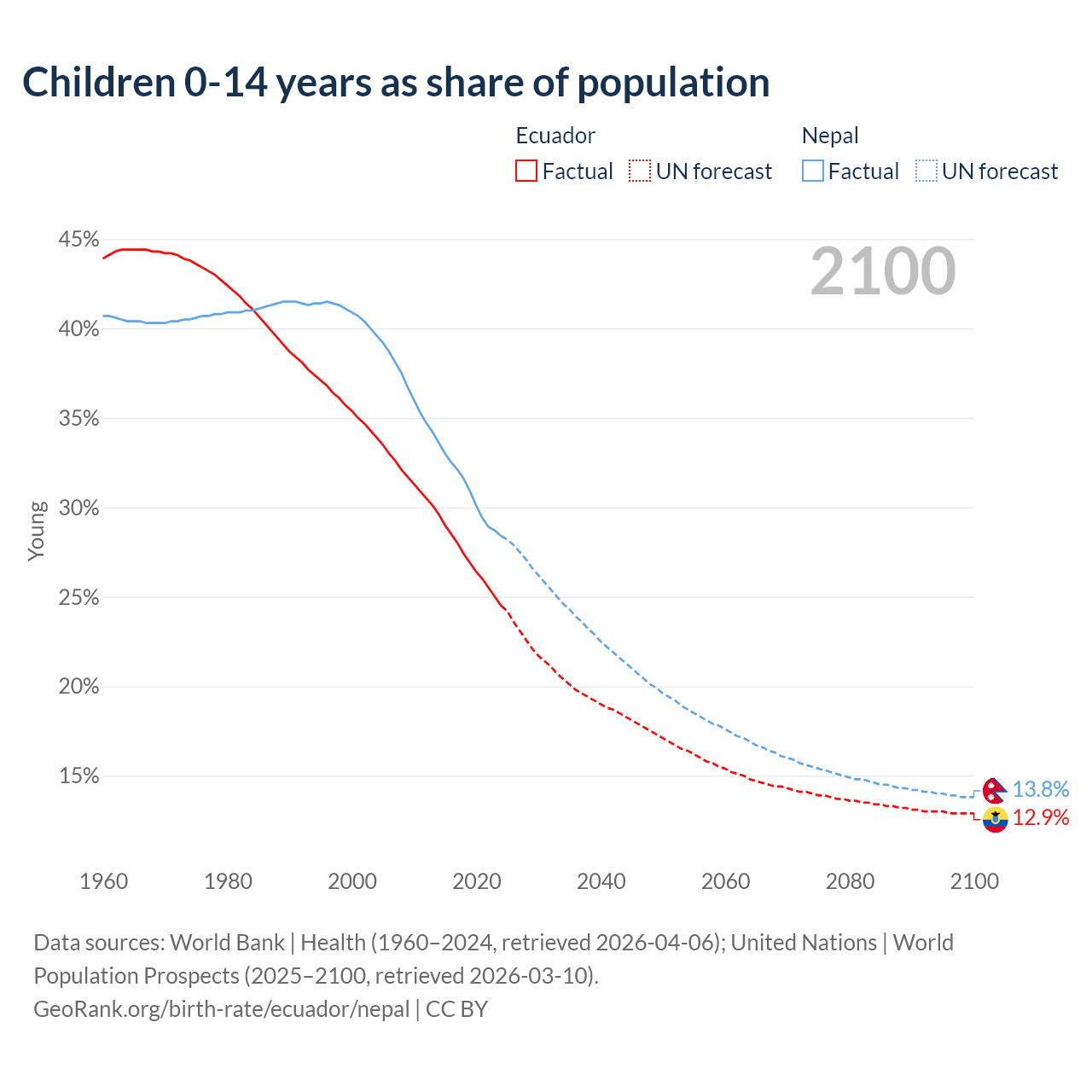 According to the latest available data on birth rates, the fertility rate in Ecuador was 1.82 children per woman in 2023, compared to 1.98 in Nepal in 2023. The replacement level is considered to be 2.1 children per woman.