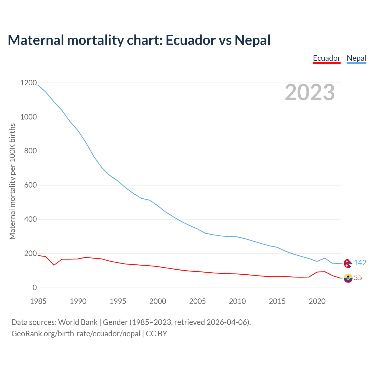 The maternal mortality rate, which is the probability of dying during childbirth or within 42 days of pregnancy termination, is 55 deaths per 100,000 live births in Ecuador, compared to 142 deaths in Nepal.