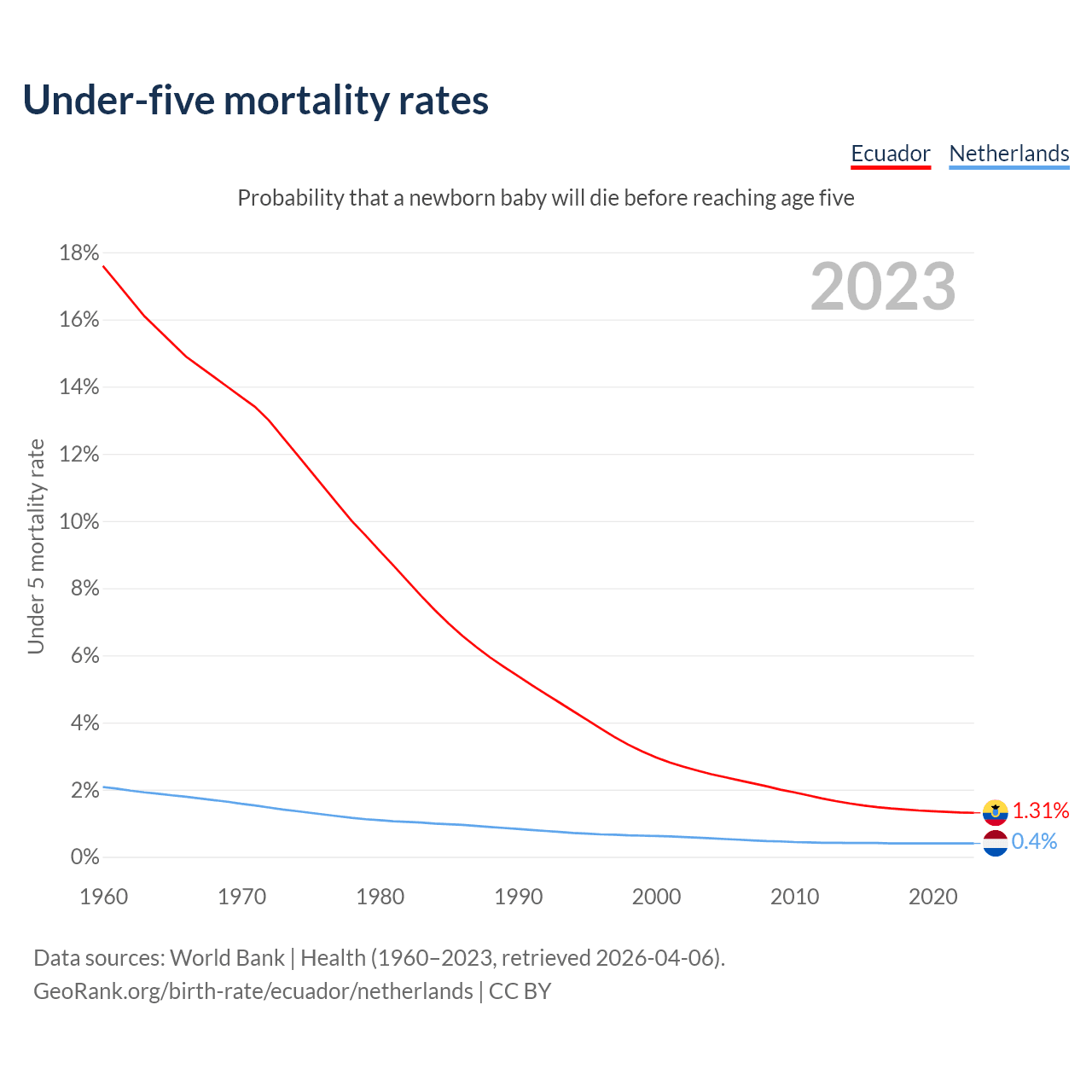 The chance that a newborn baby will die before reaching age five is 1.31% in Ecuador and 0.4% in the Netherlands. Above is a chart with historical data on under-five mortality rates.