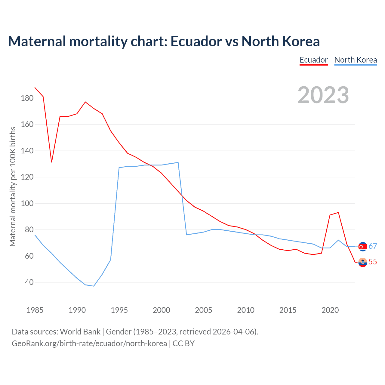 The maternal mortality rate, which is the probability of dying during childbirth or within 42 days of pregnancy termination, is 55 deaths per 100,000 live births in Ecuador, compared to 67 deaths in North Korea.