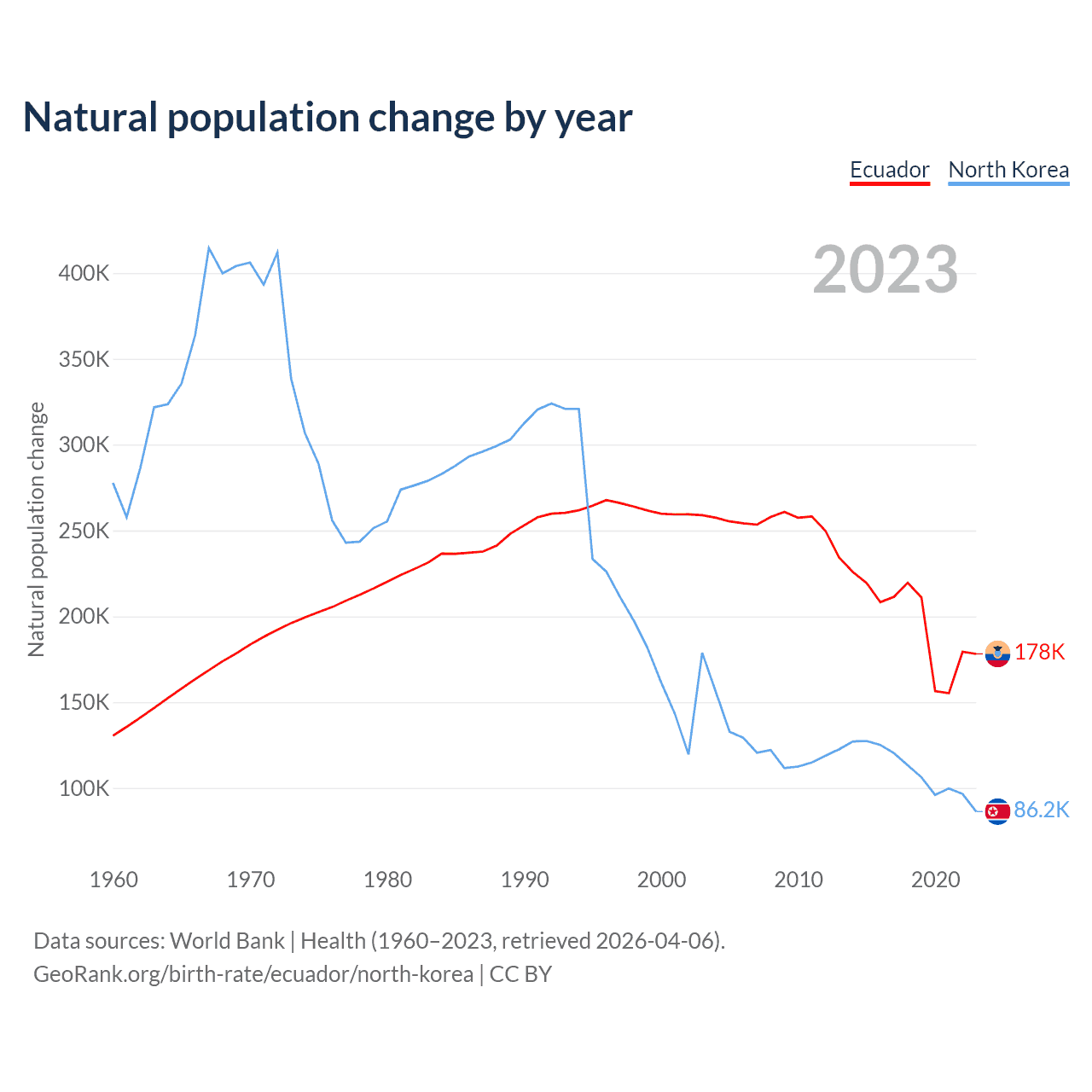 Ecuador has an annual birth rate of 15 births per 1,000 people, compared to 12.9 for North Korea. The average number of children a woman is expected to have during her lifetime — the fertility rate, is 1.82 in Ecuador and 1.78 in North Korea — 2.36% difference.