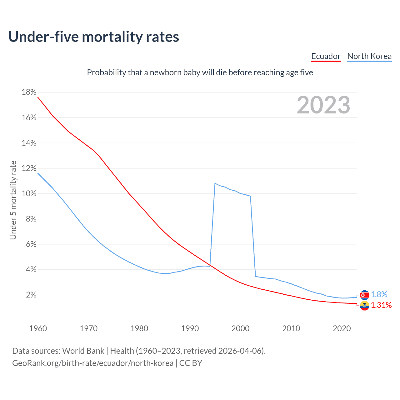 The chance that a newborn baby will die before reaching age five is 1.31% in Ecuador and 1.8% in North Korea. Above is a chart with historical data on under-five mortality rates.