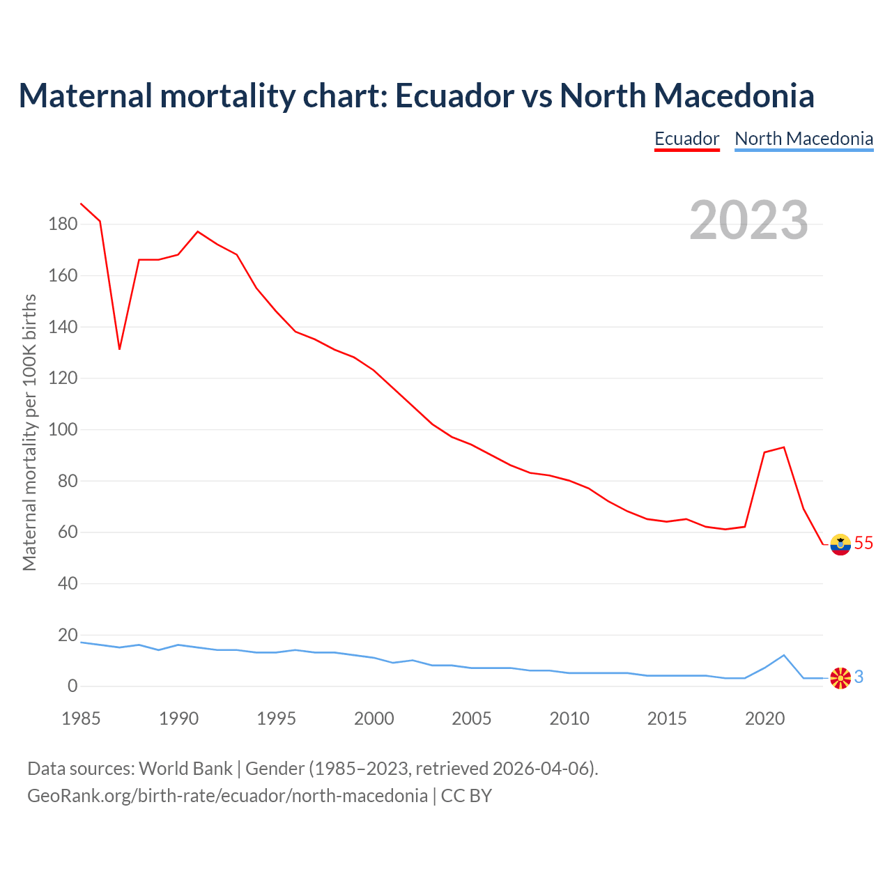 The maternal mortality rate, which is the probability of dying during childbirth or within 42 days of pregnancy termination, is 55 deaths per 100,000 live births in Ecuador, compared to 3 deaths in North Macedonia.