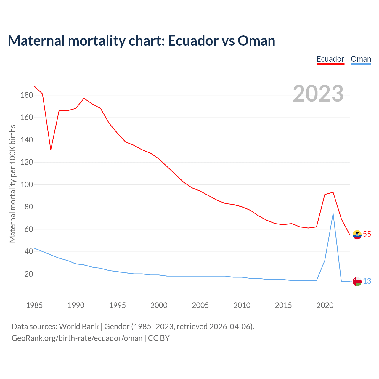 The maternal mortality rate, which is the probability of dying during childbirth or within 42 days of pregnancy termination, is 55 deaths per 100,000 live births in Ecuador, compared to 13 deaths in Oman.