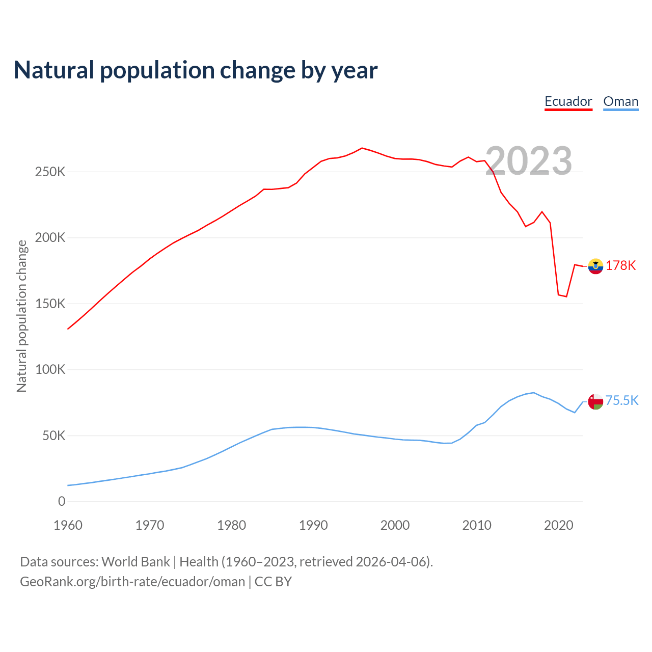 Ecuador has an annual birth rate of 15 births per 1,000 people, compared to 16.8 for Oman. The average number of children a woman is expected to have during her lifetime — the fertility rate, is 1.82 in Ecuador and 2.53 in Oman — 38.5% difference.