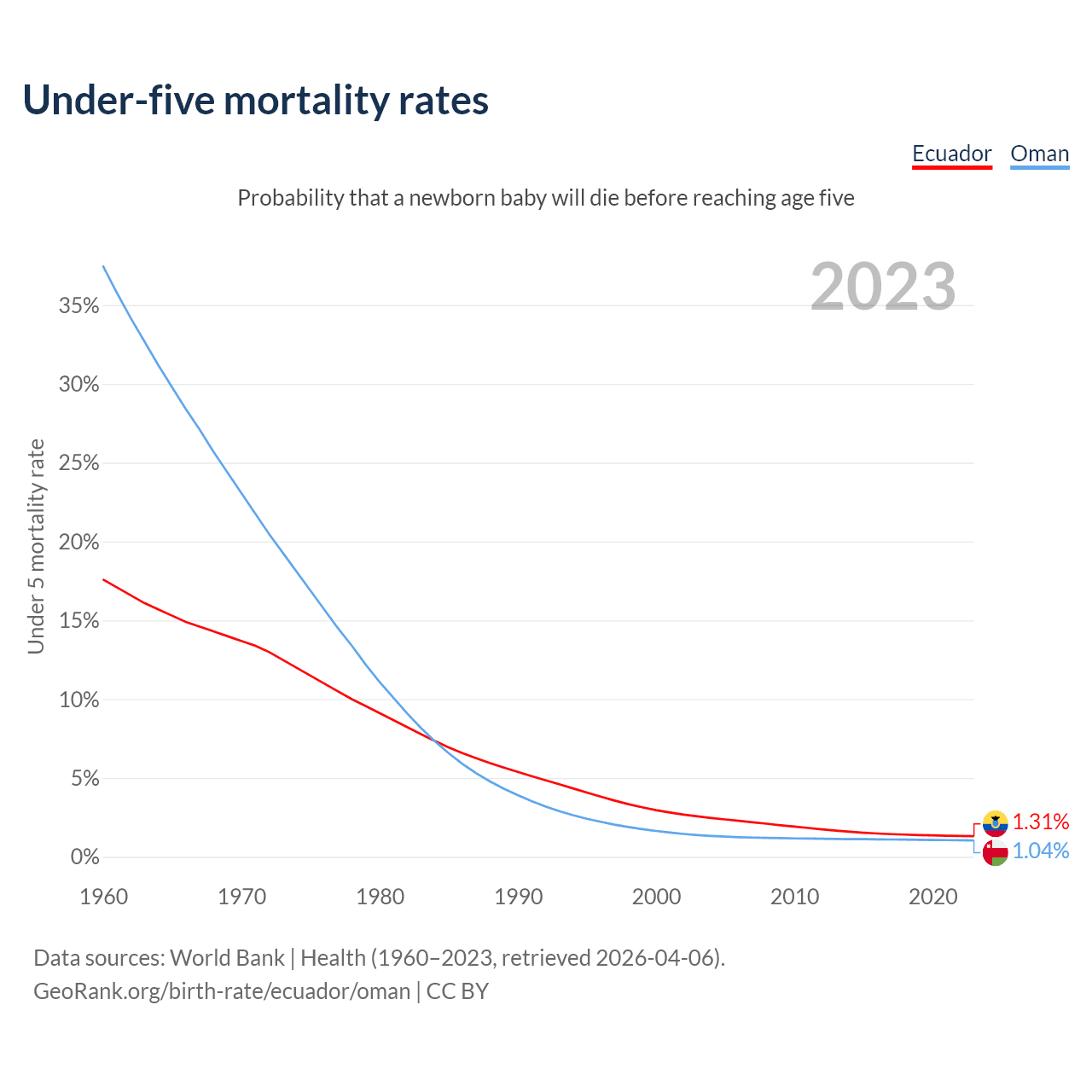 The chance that a newborn baby will die before reaching age five is 1.31% in Ecuador and 1.04% in Oman. Above is a chart with historical data on under-five mortality rates.