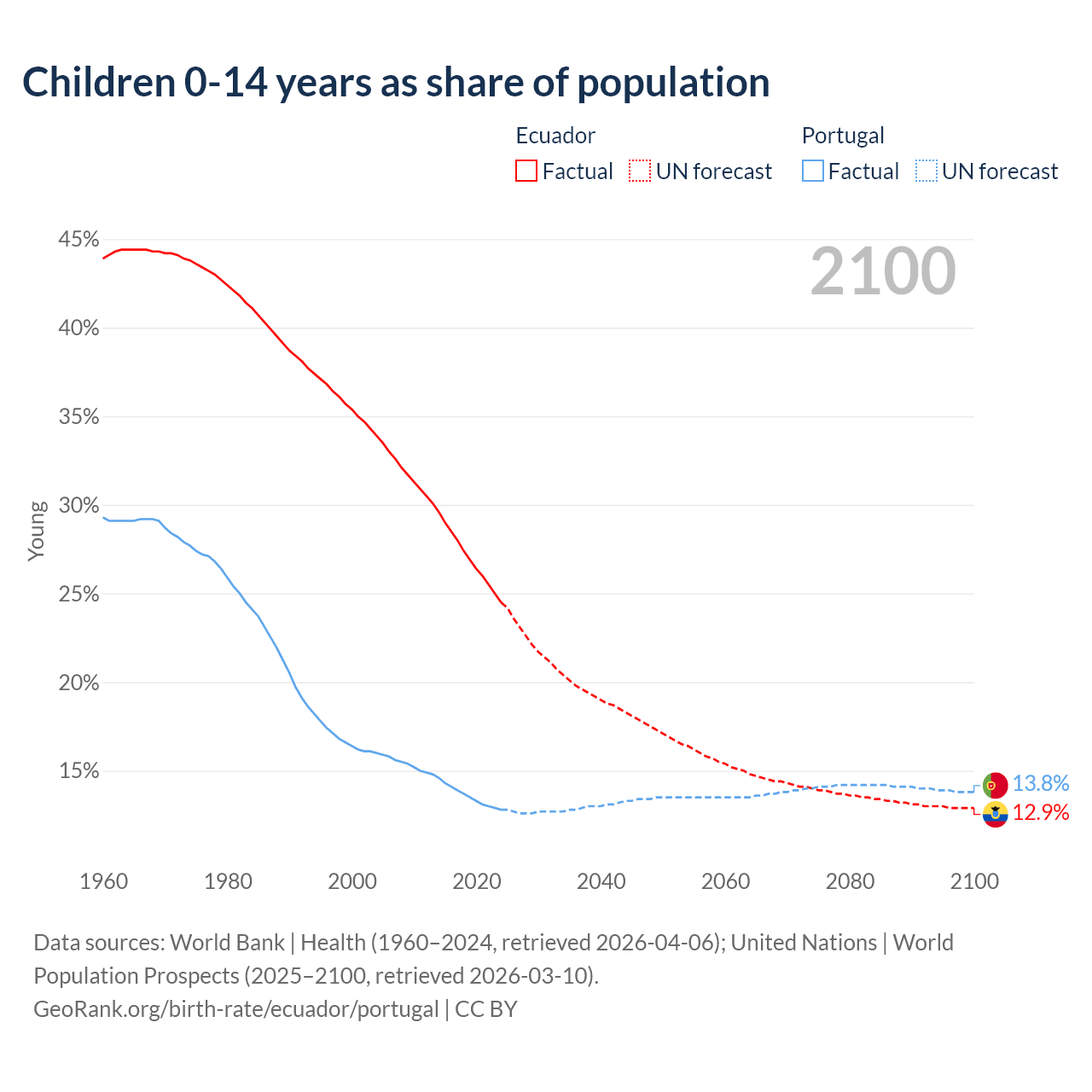 According to the latest available data on birth rates, the fertility rate in Ecuador was 1.82 children per woman in 2023, compared to 1.44 in Portugal in 2023. The replacement level is considered to be 2.1 children per woman.