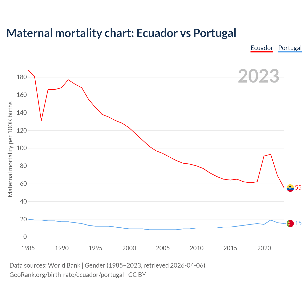 The maternal mortality rate, which is the probability of dying during childbirth or within 42 days of pregnancy termination, is 55 deaths per 100,000 live births in Ecuador, compared to 15 deaths in Portugal.