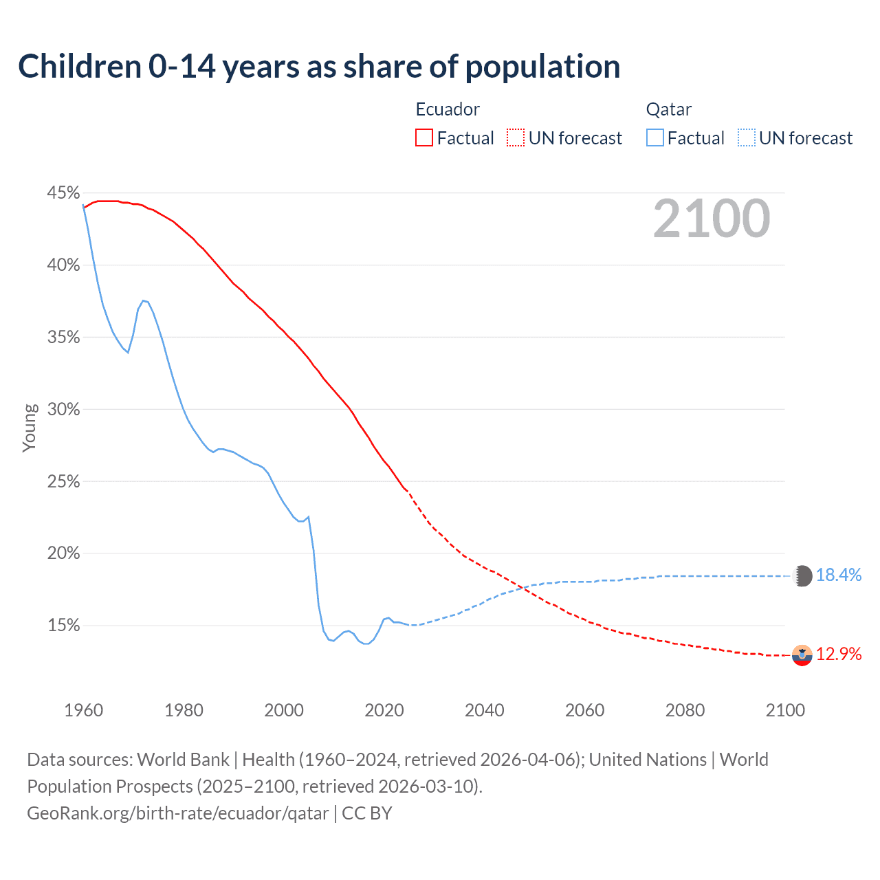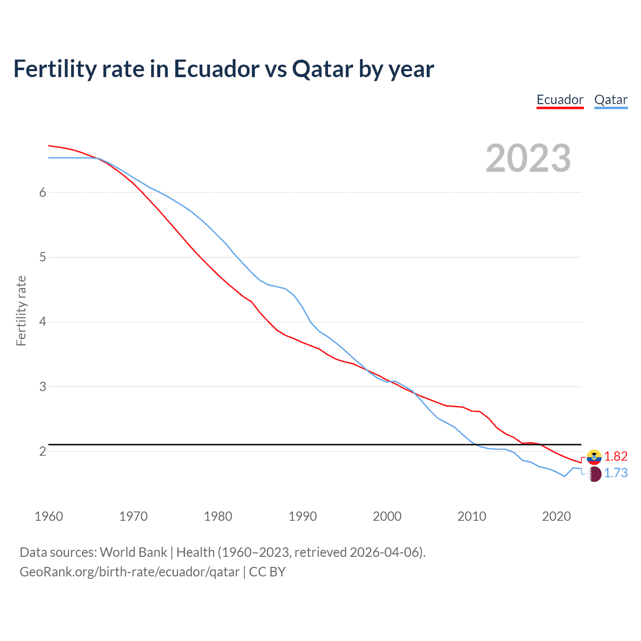 According to the latest available data on birth rates, the fertility rate in Ecuador was 1.82 children per woman in 2023, compared to 1.73 in Qatar in 2023. The replacement level is considered to be 2.1 children per woman.