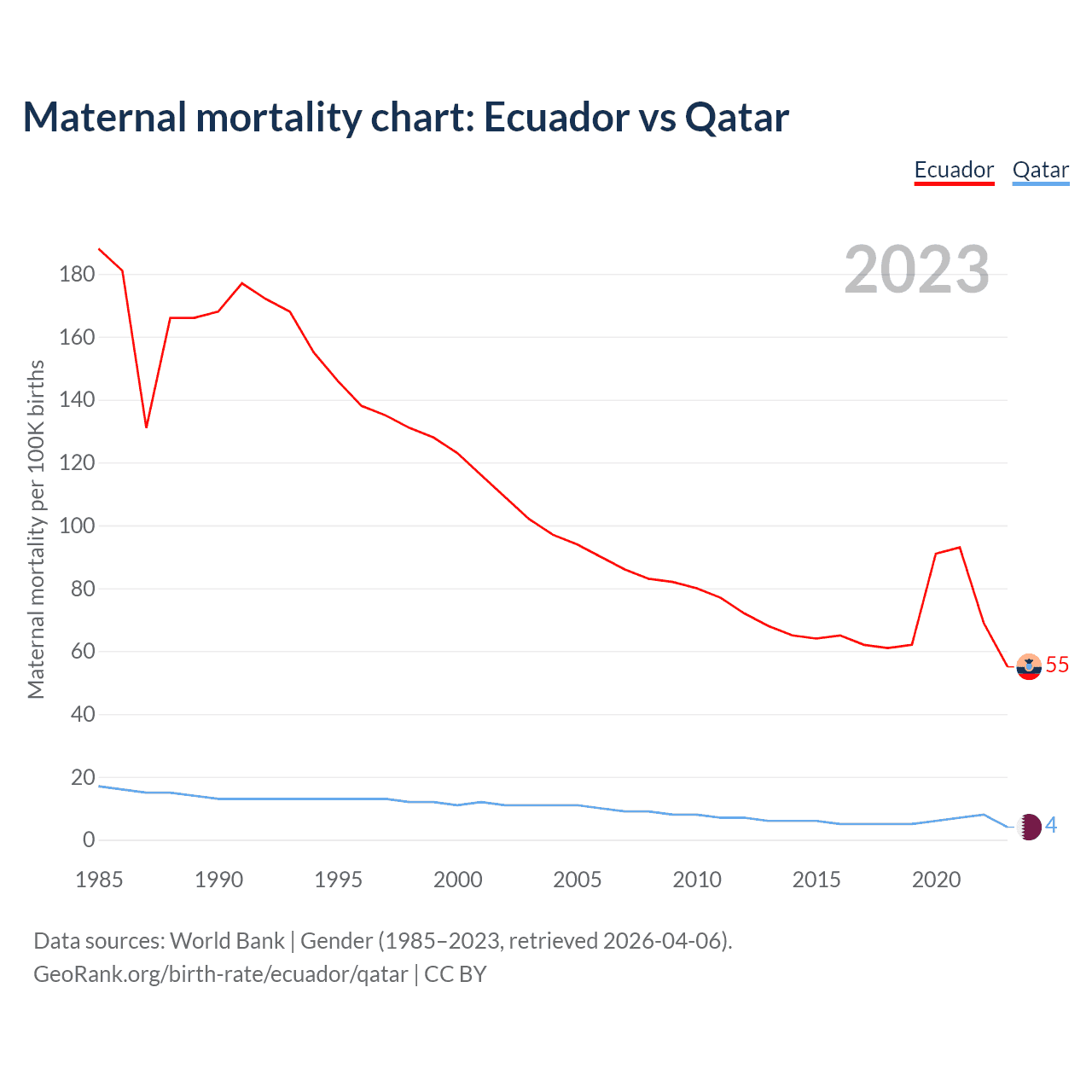 The maternal mortality rate, which is the probability of dying during childbirth or within 42 days of pregnancy termination, is 55 deaths per 100,000 live births in Ecuador, compared to 4 deaths in Qatar.