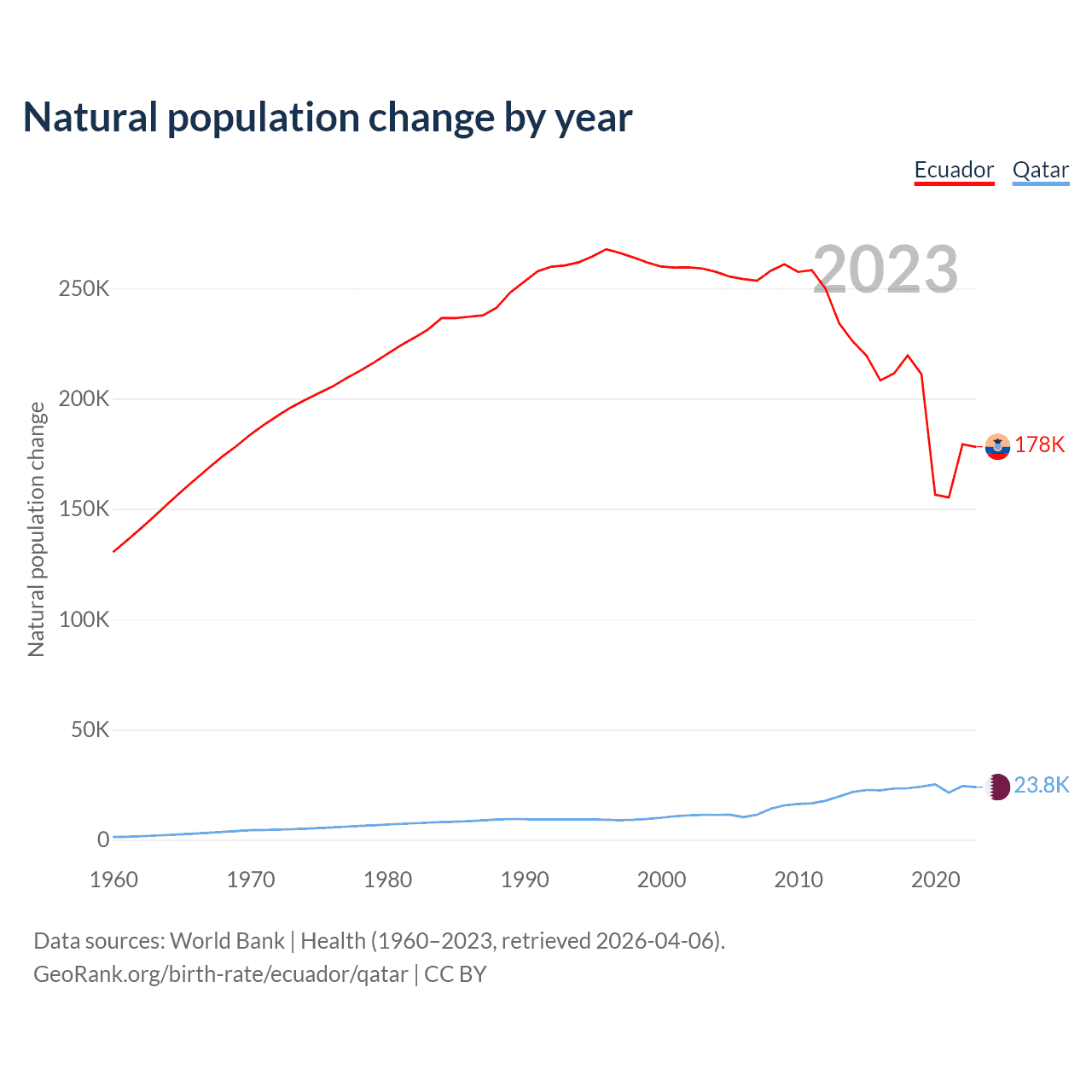 Ecuador has an annual birth rate of 15 births per 1,000 people, compared to 9.91 for Qatar. The average number of children a woman is expected to have during her lifetime — the fertility rate, is 1.82 in Ecuador and 1.73 in Qatar — 5.16% difference.