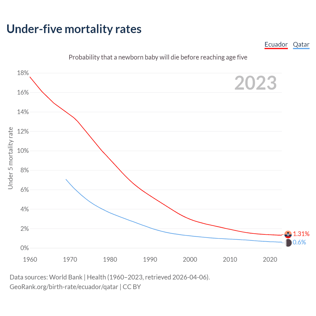 The chance that a newborn baby will die before reaching age five is 1.31% in Ecuador and 0.6% in Qatar. Above is a chart with historical data on under-five mortality rates.