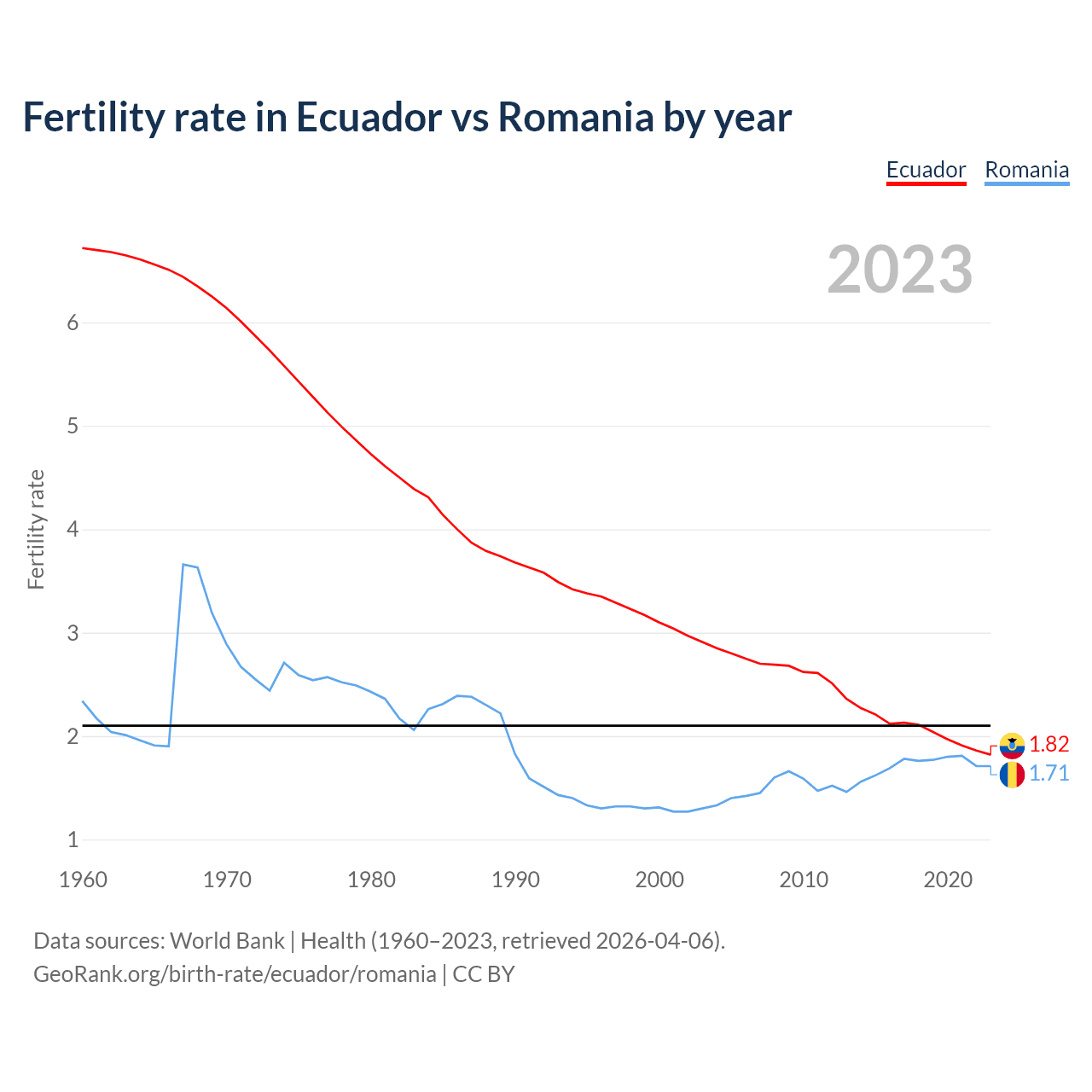 1960 vs 2023, the fertility rate has decreased by 72.9% in Ecuador and by 26.9% in Romania — in 1960, it was 6.72 and 2.34, respectively.
