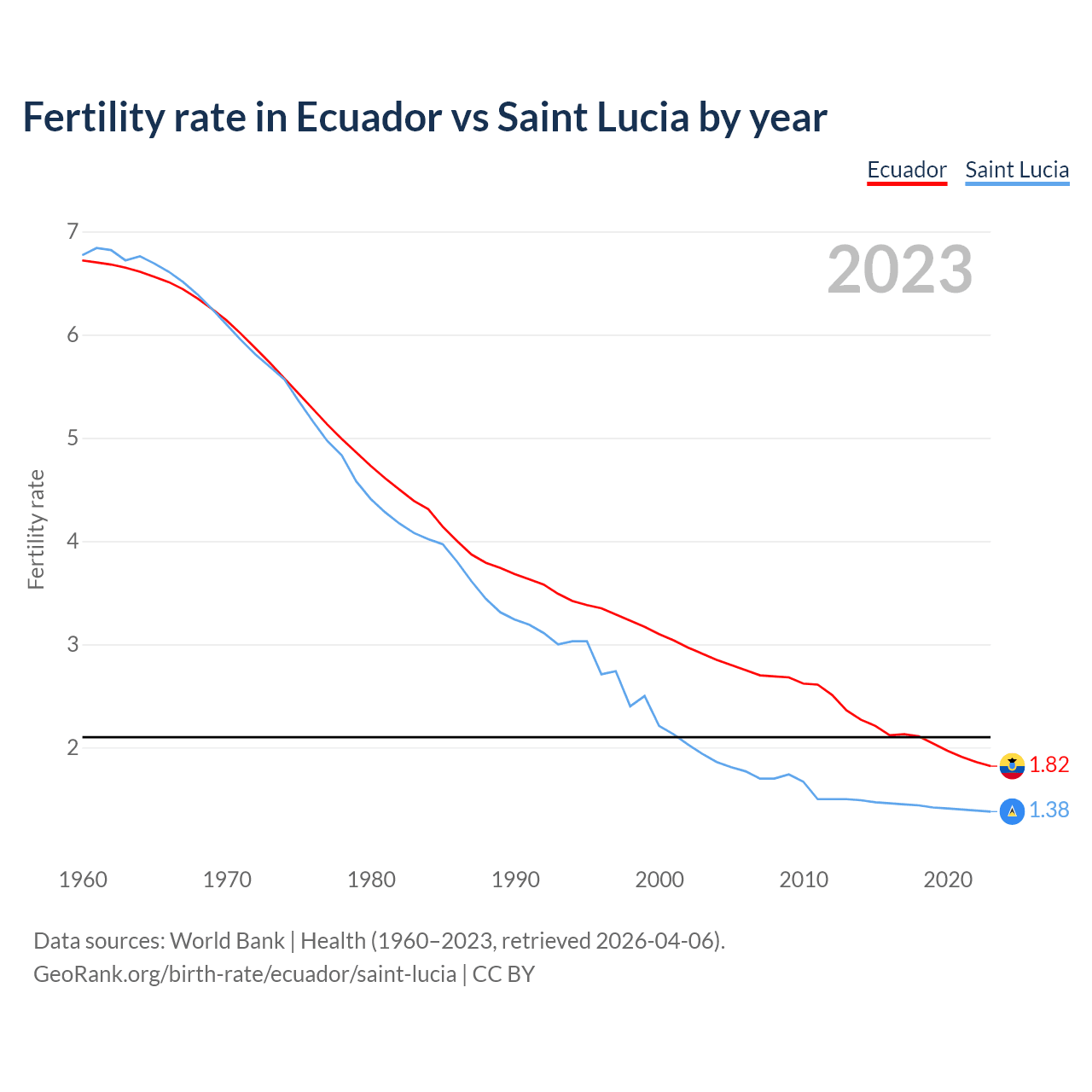 1960 vs 2023, the fertility rate has decreased by 72.9% in Ecuador and by 79.6% in Saint Lucia — in 1960, it was 6.72 and 6.77, respectively.