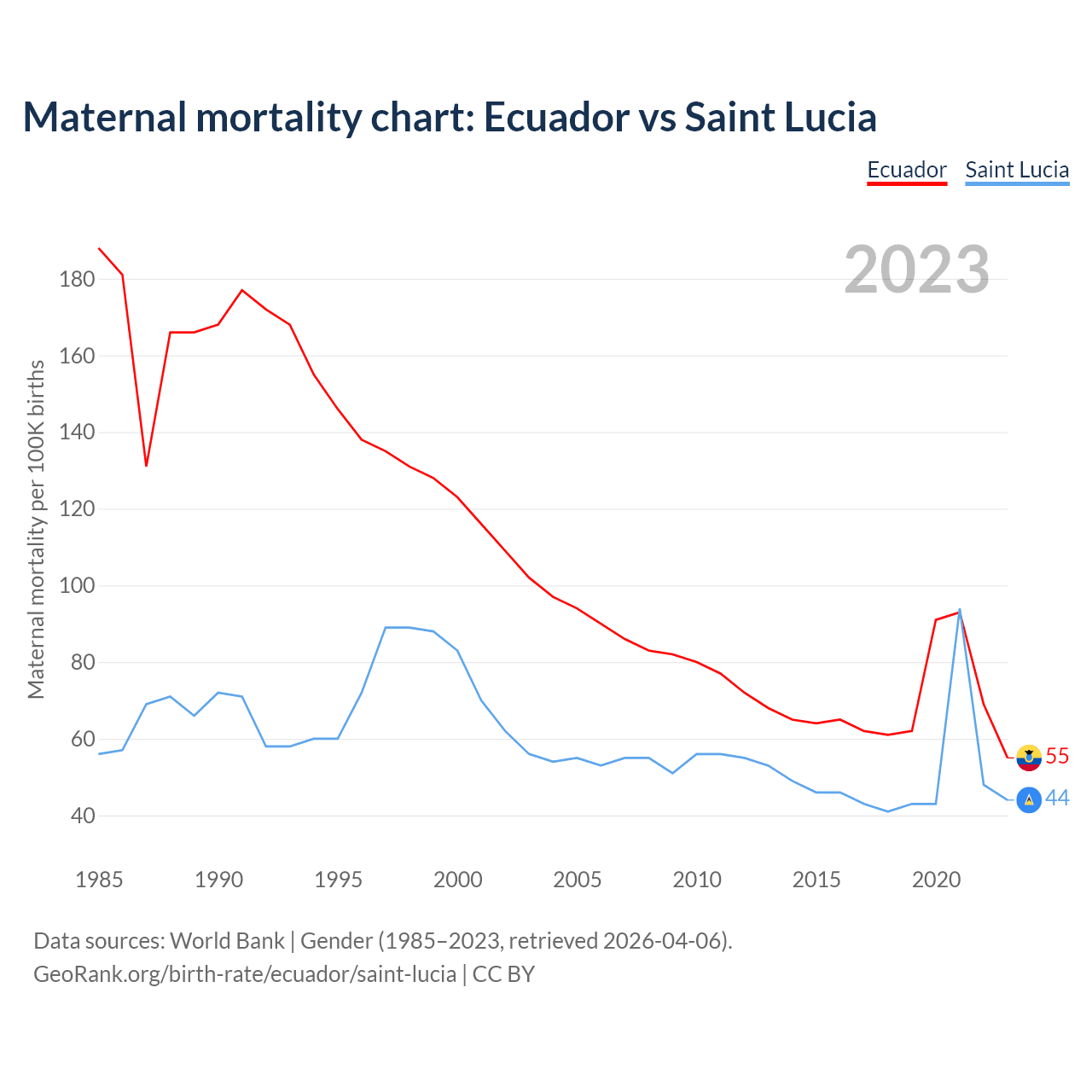 The maternal mortality rate, which is the probability of dying during childbirth or within 42 days of pregnancy termination, is 55 deaths per 100,000 live births in Ecuador, compared to 44 deaths in Saint Lucia.