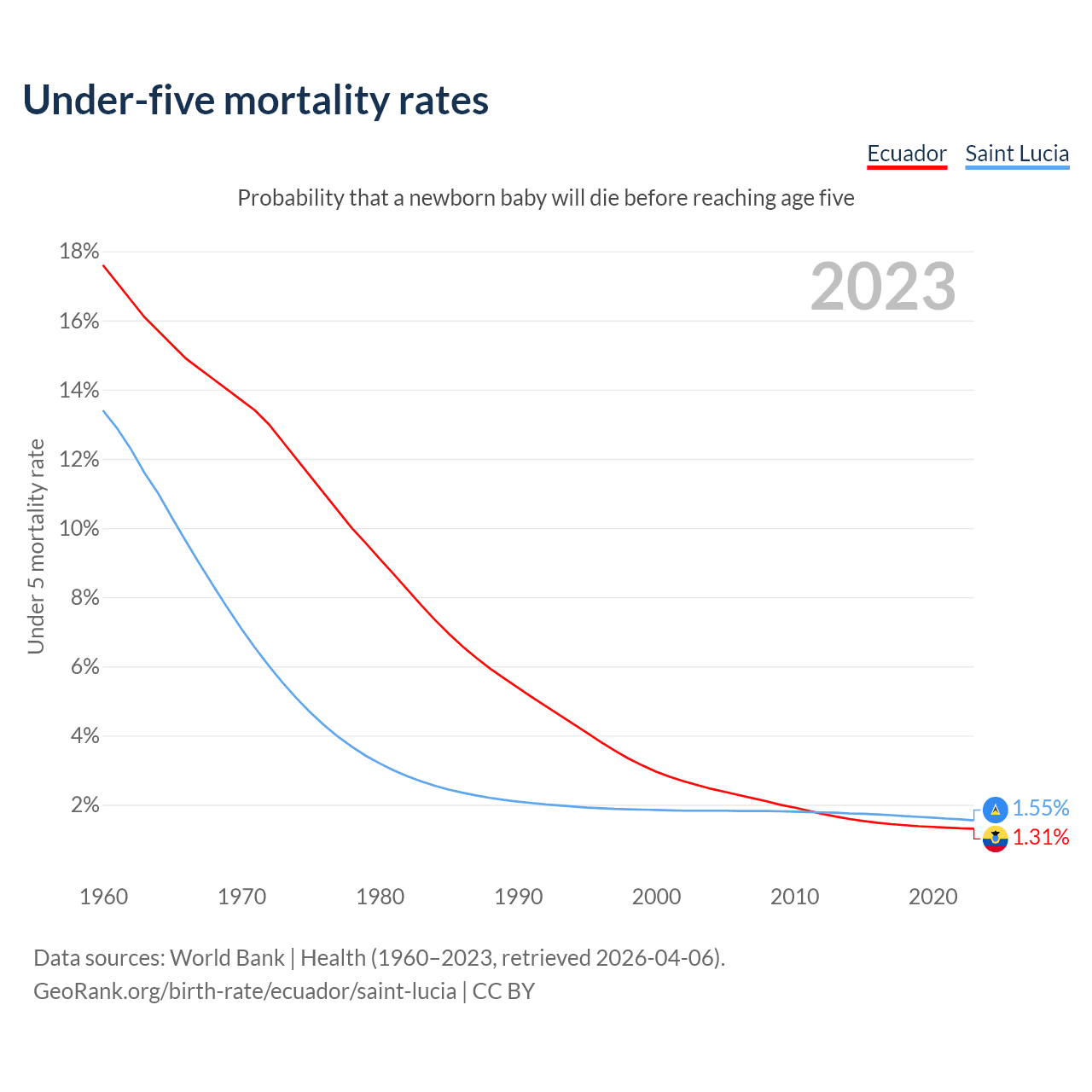 The chance that a newborn baby will die before reaching age five is 1.31% in Ecuador and 1.55% in Saint Lucia. Above is a chart with historical data on under-five mortality rates.