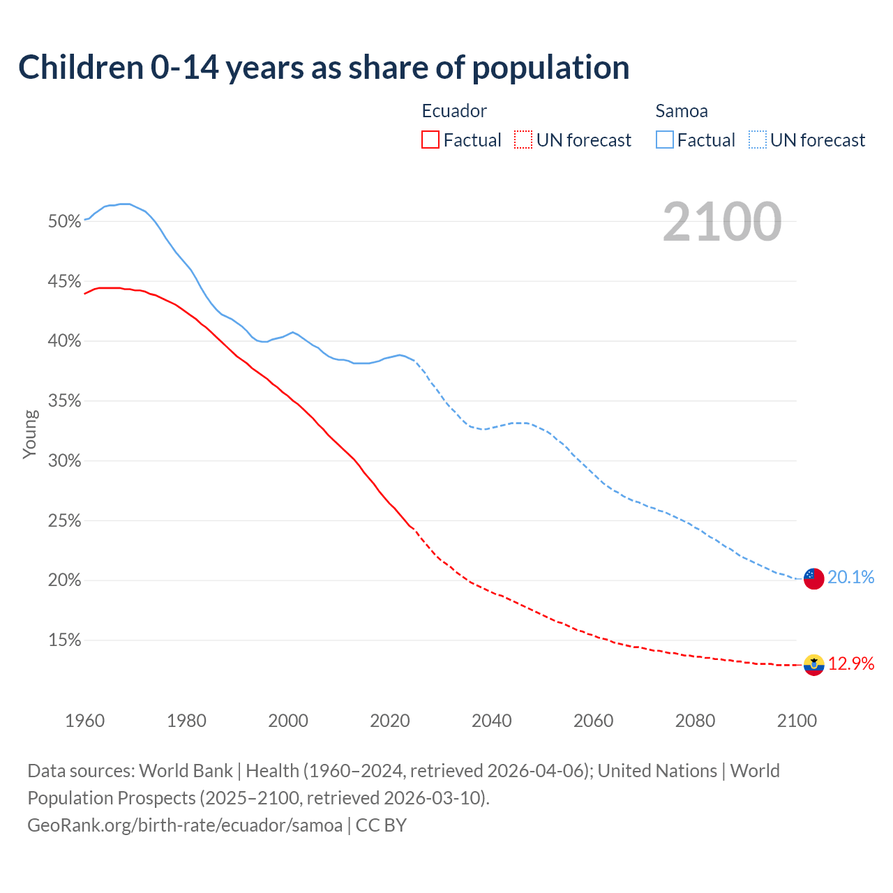 Ecuador has an annual birth rate of 15 births per 1,000 people, compared to 25.4 for Samoa. The average number of children a woman is expected to have during her lifetime — the fertility rate, is 1.82 in Ecuador and 3.83 in Samoa — 110% difference.