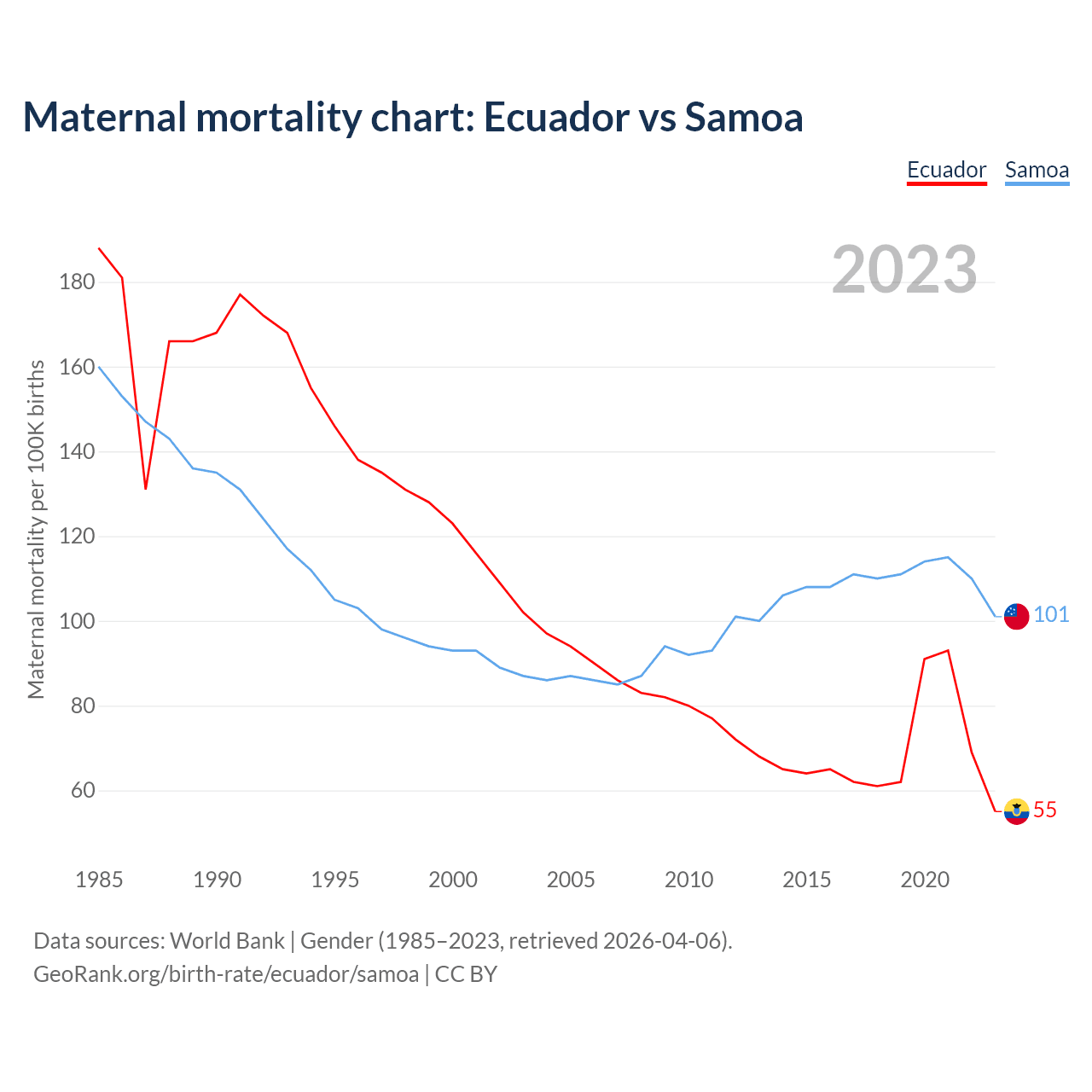 The maternal mortality rate, which is the probability of dying during childbirth or within 42 days of pregnancy termination, is 55 deaths per 100,000 live births in Ecuador, compared to 101 deaths in Samoa.