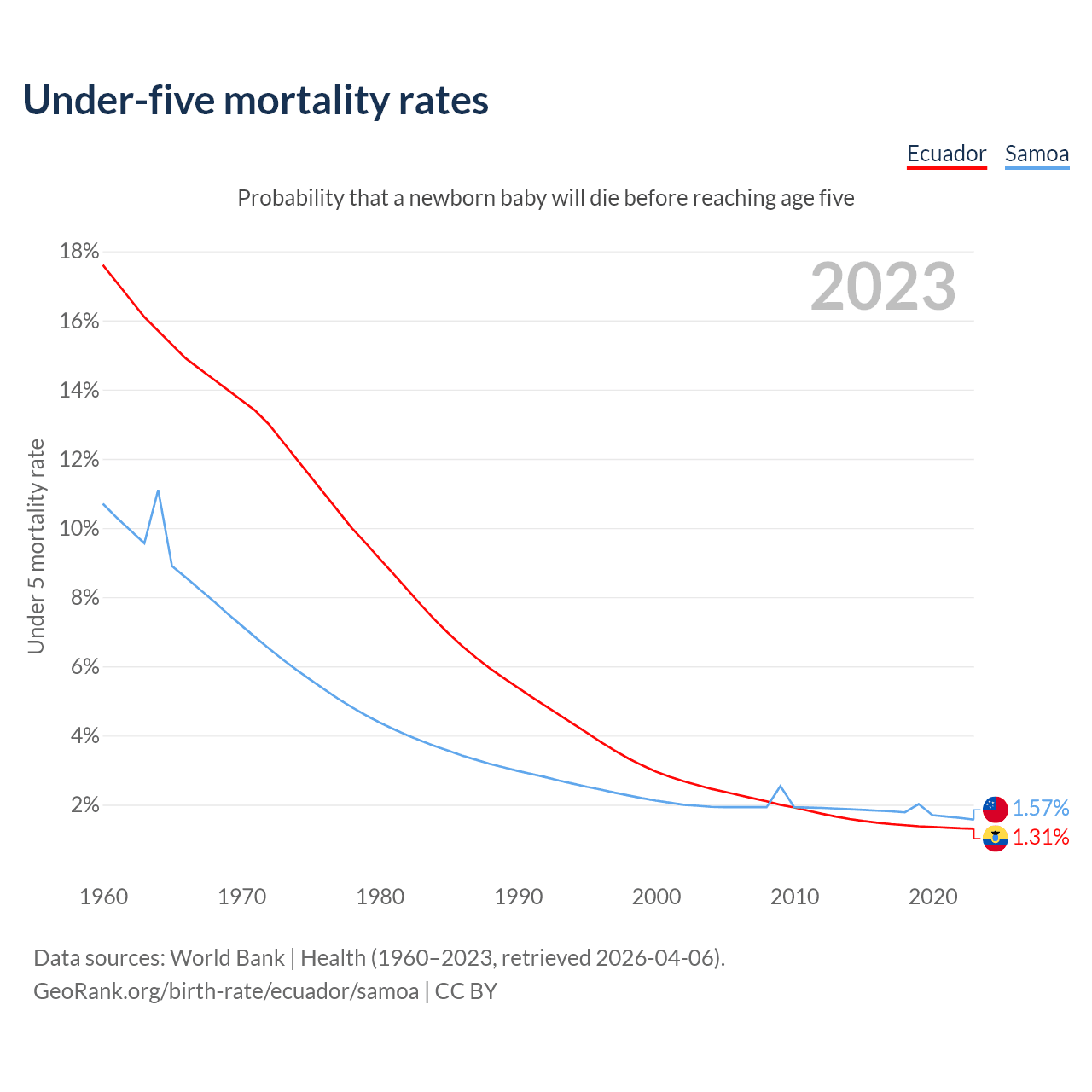The chance that a newborn baby will die before reaching age five is 1.31% in Ecuador and 1.57% in Samoa. Above is a chart with historical data on under-five mortality rates.