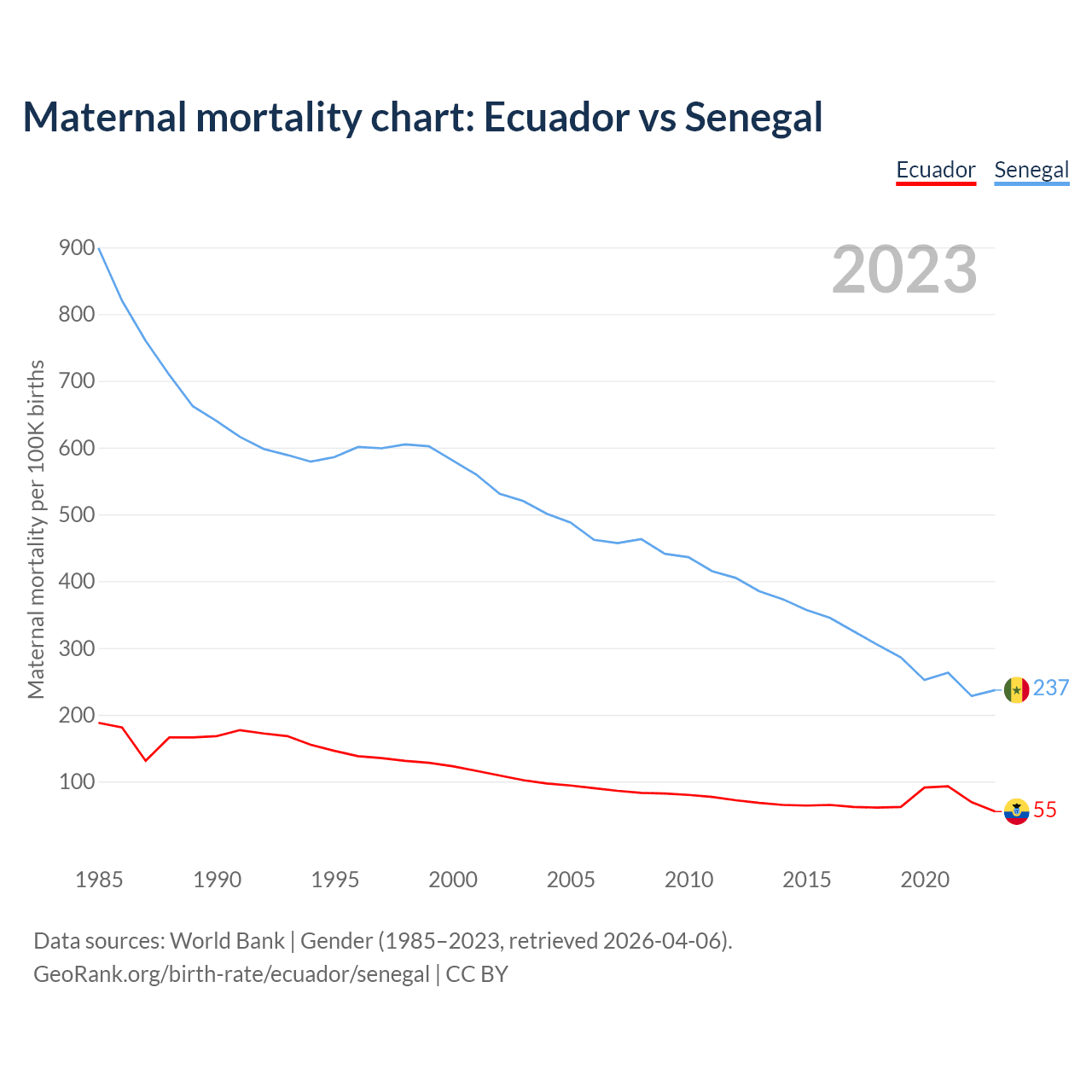 The maternal mortality rate, which is the probability of dying during childbirth or within 42 days of pregnancy termination, is 55 deaths per 100,000 live births in Ecuador, compared to 237 deaths in Senegal.