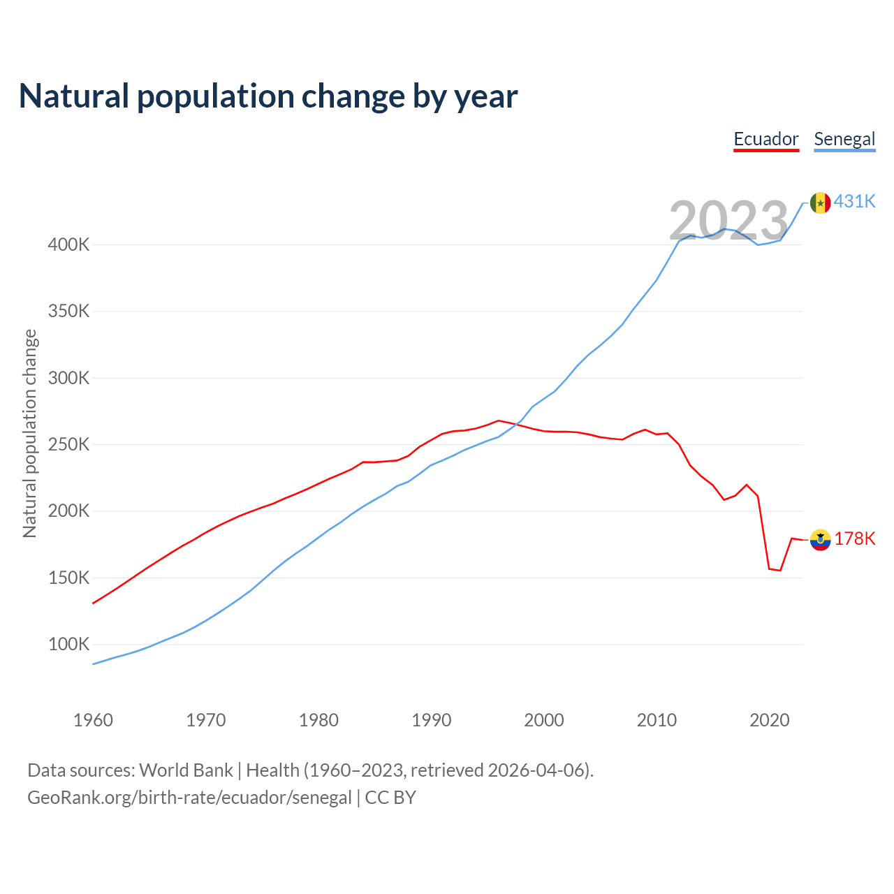 Ecuador has an annual birth rate of 15 births per 1,000 people, compared to 29.4 for Senegal. The average number of children a woman is expected to have during her lifetime — the fertility rate, is 1.82 in Ecuador and 3.82 in Senegal — 109.4% difference.