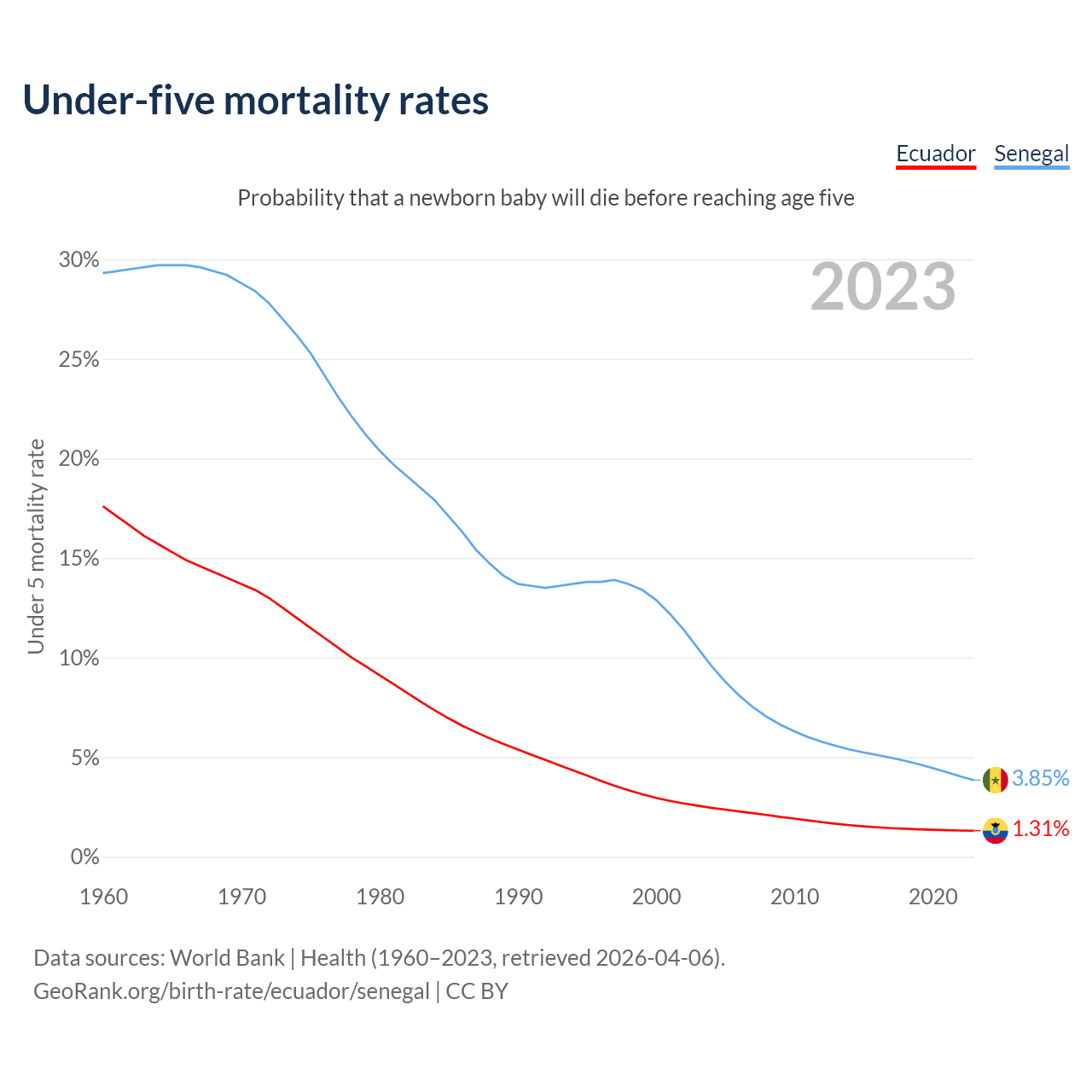 The chance that a newborn baby will die before reaching age five is 1.31% in Ecuador and 3.85% in Senegal. Above is a chart with historical data on under-five mortality rates.