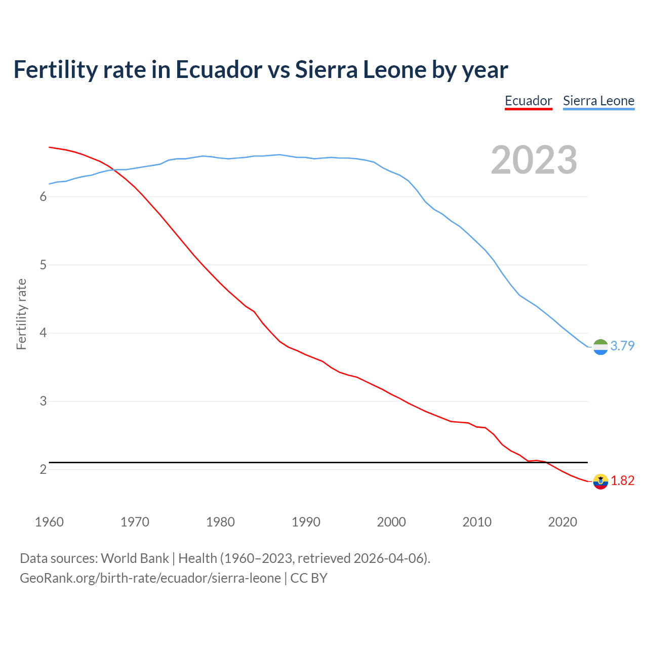 1960 vs 2023, the fertility rate has decreased by 72.9% in Ecuador and by 38.6% in Sierra Leone — in 1960, it was 6.72 and 6.18, respectively.