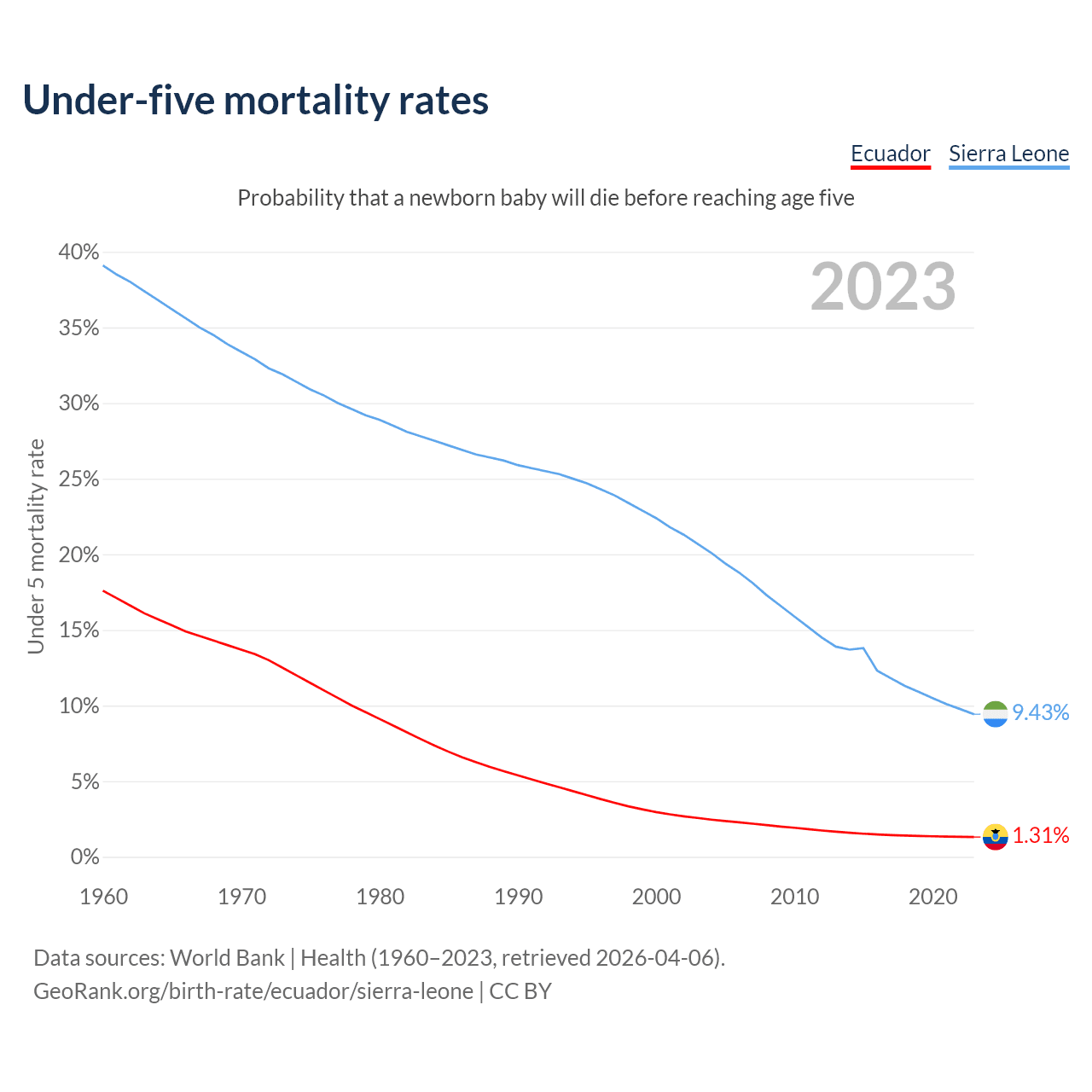 The chance that a newborn baby will die before reaching age five is 1.31% in Ecuador and 9.43% in Sierra Leone. Above is a chart with historical data on under-five mortality rates.
