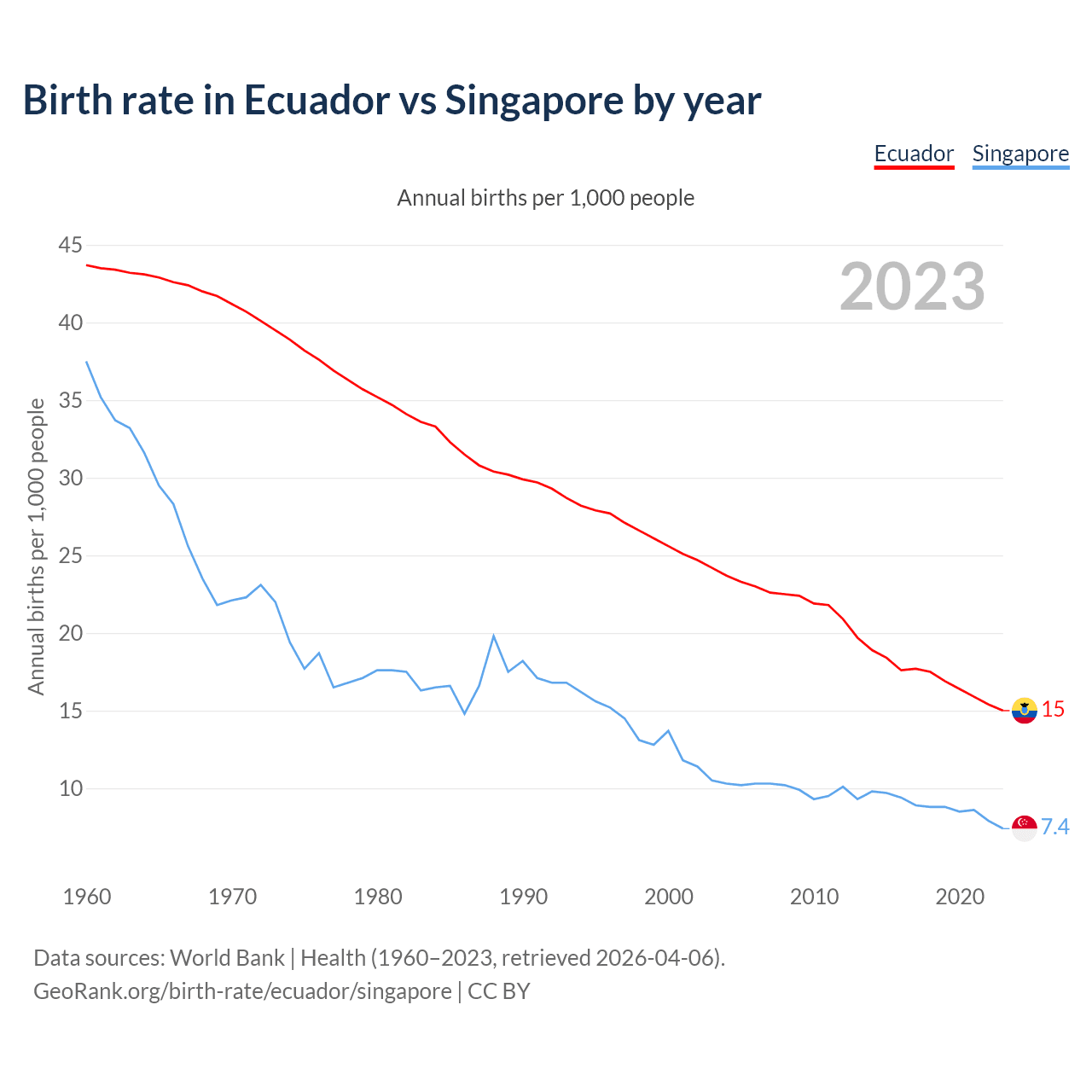 Ecuador has an annual birth rate of 15 births per 1,000 people, compared to 7.4 for Singapore. The average number of children a woman is expected to have during her lifetime — the fertility rate, is 1.82 in Ecuador and 0.97 in Singapore — 46.8% difference.